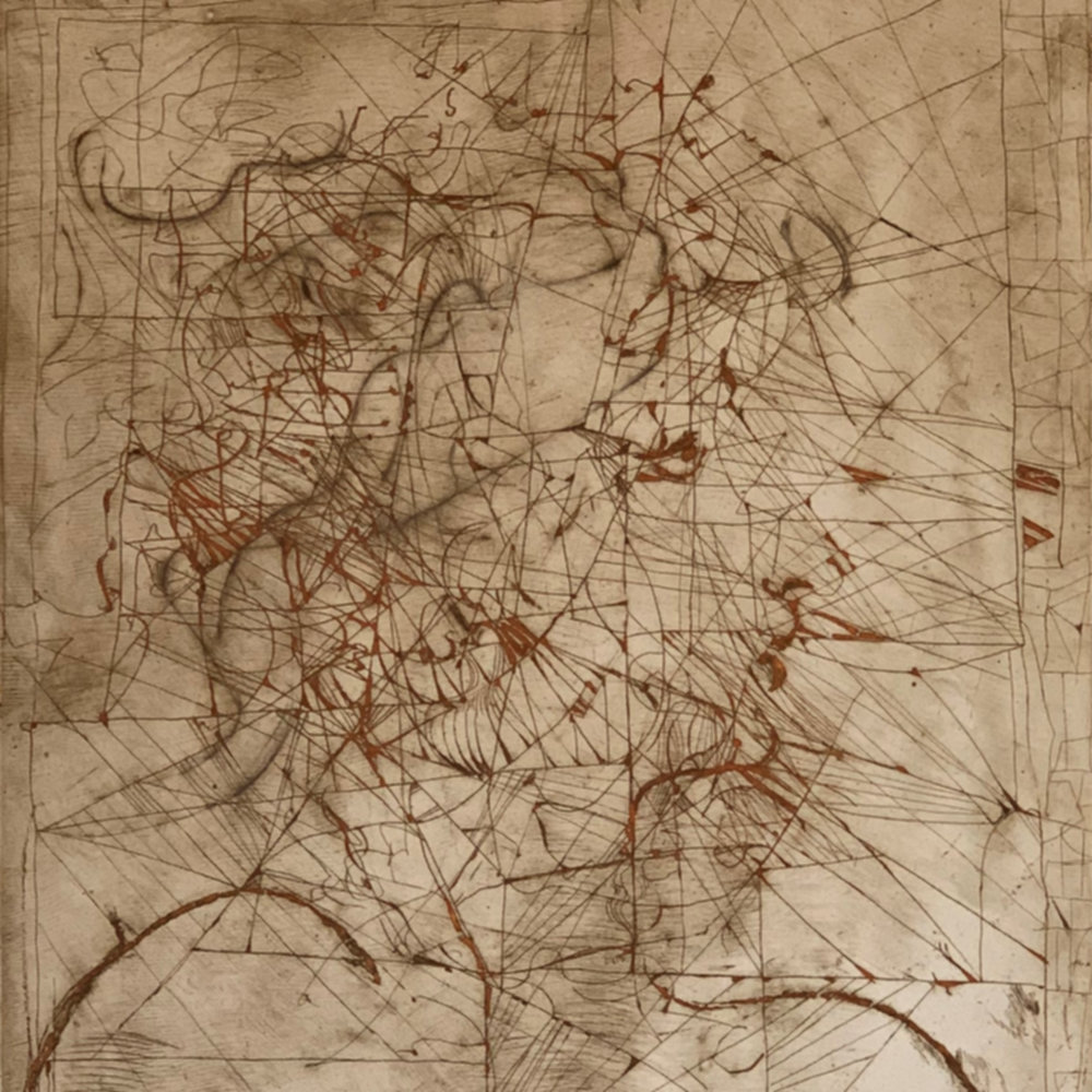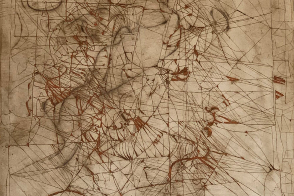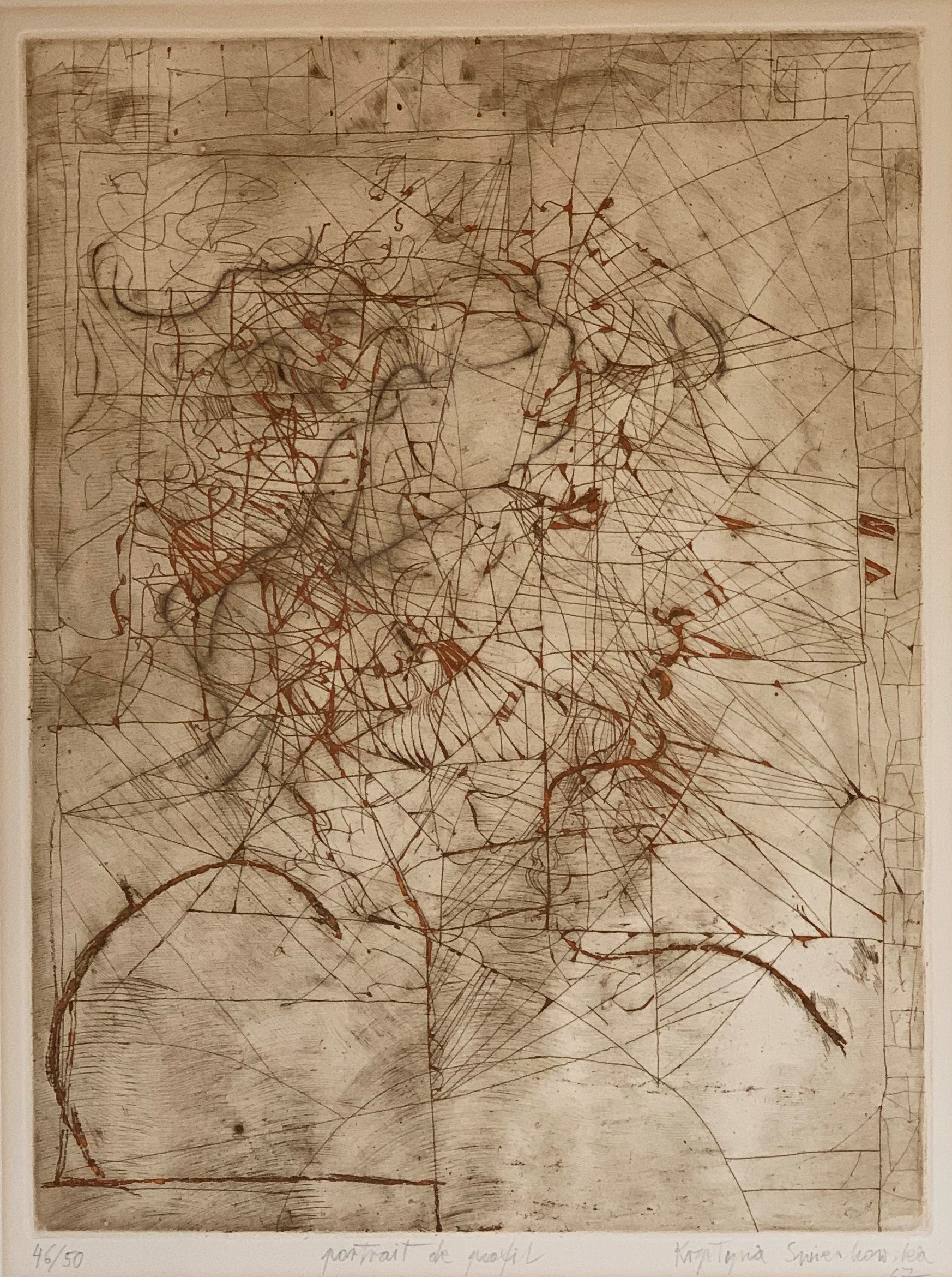 Polish-born printmaker Krystyna Smiechowska draws her inspiration from ancient maps and inscriptions and Slavic manuscripts from the High Middle Ages.  She constructs abstract works in which the ancient writings and runes are integrated into the drawing and confer an aura of mystery to the work.