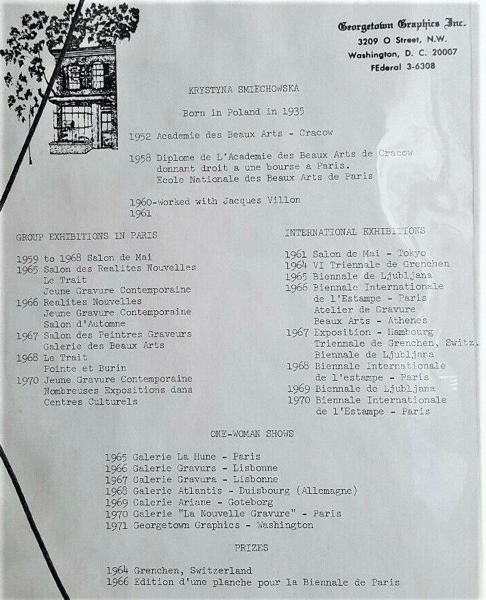 Smiechowska was particularly active in the 1960s and 1970s, including important shows at the Regency Gallery in Brussels in 1968 and the Georgetown Graphics Gallery in Washington DC in 1971.  She participated in 1973 at the Biennale de Paris.