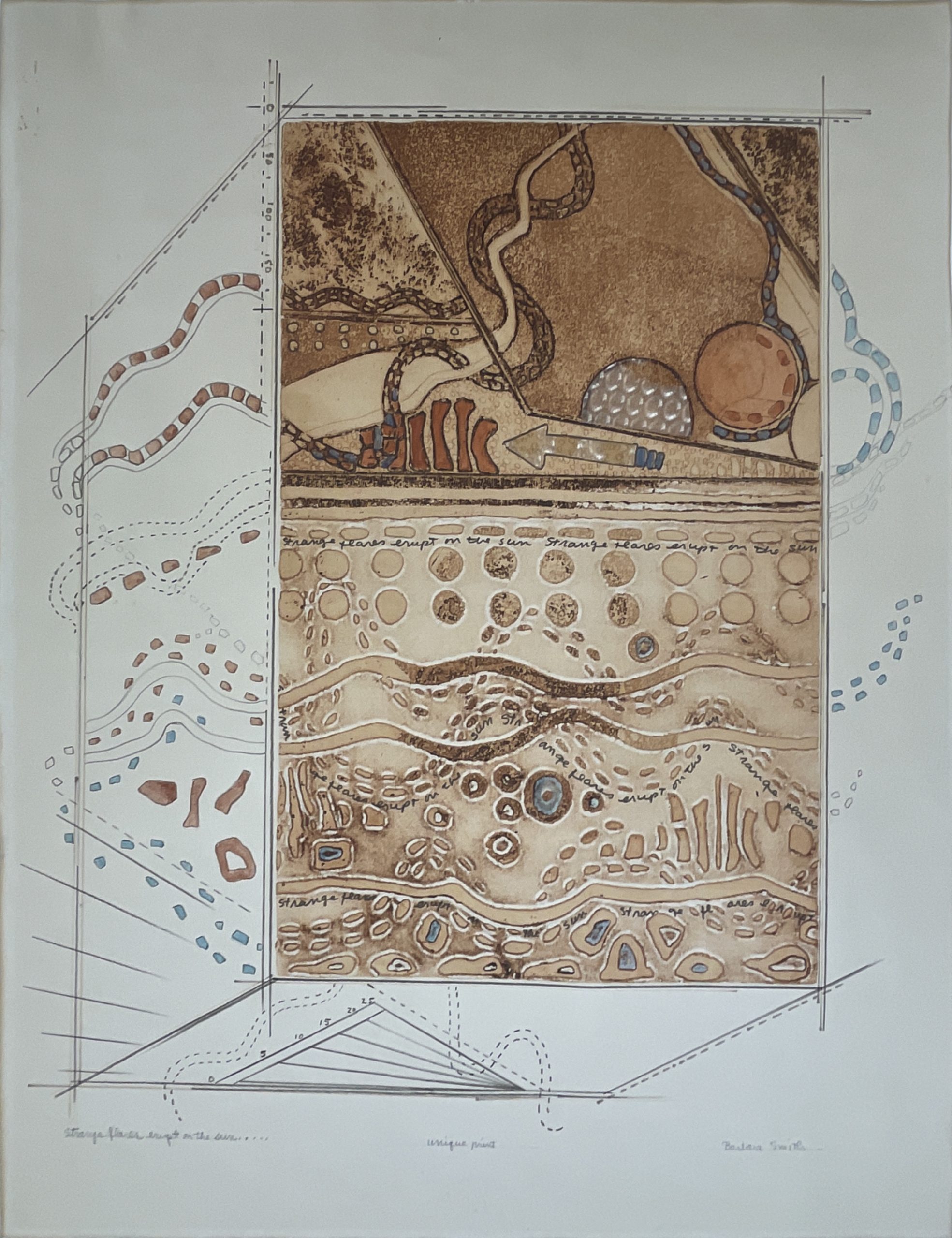 Cleveland-based printmaker Barbara Dworkin Smith was productive and popular.  Though she was a favorite daughter of the Ohio art scene, she had an active exhibition calendar in venues all over the country, particularly in the 1970s.  This picture exemplifies her work, with the organic and earthy feel she often presented, highly-structured but offset with organic forms and organic colors.