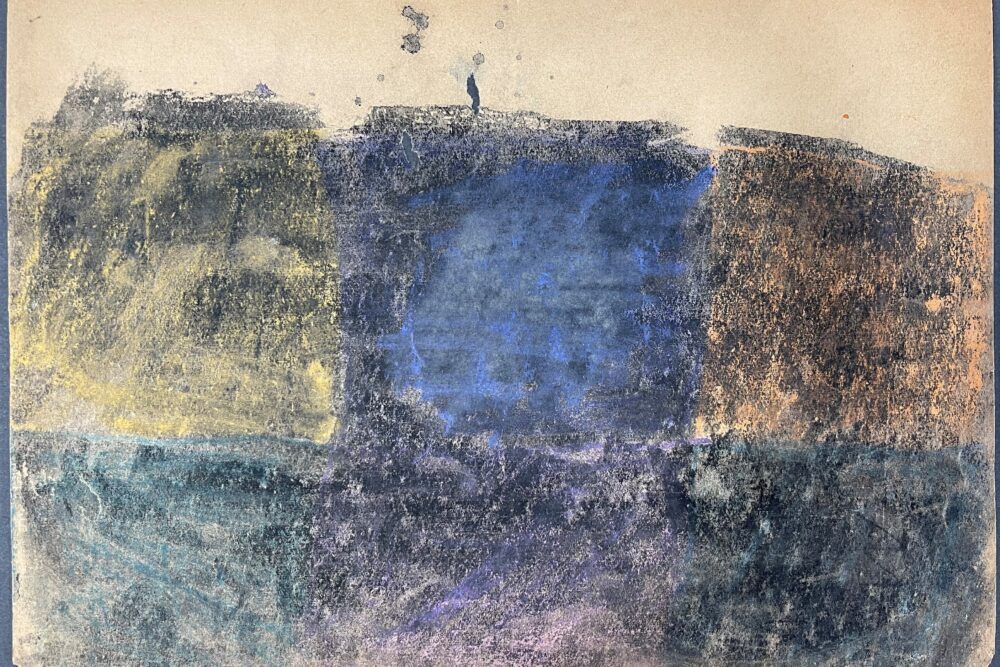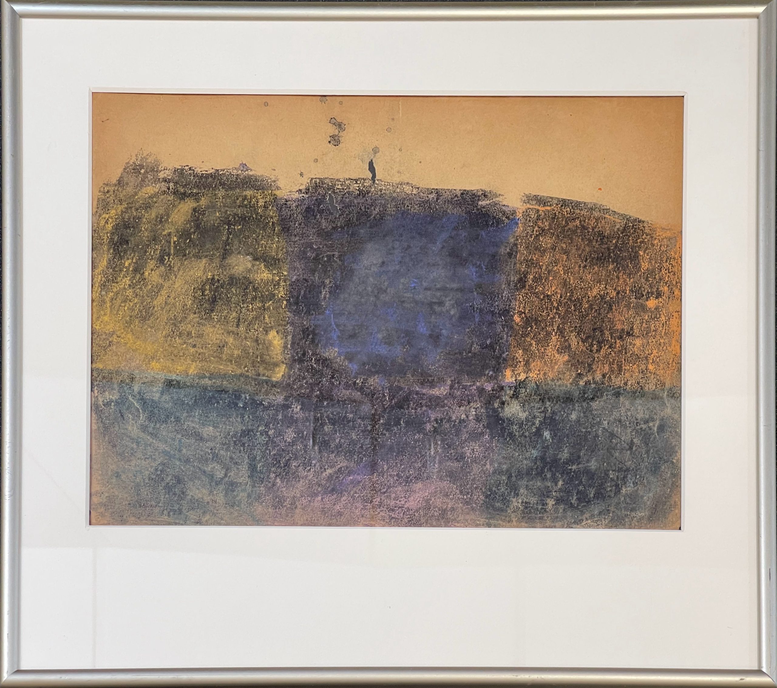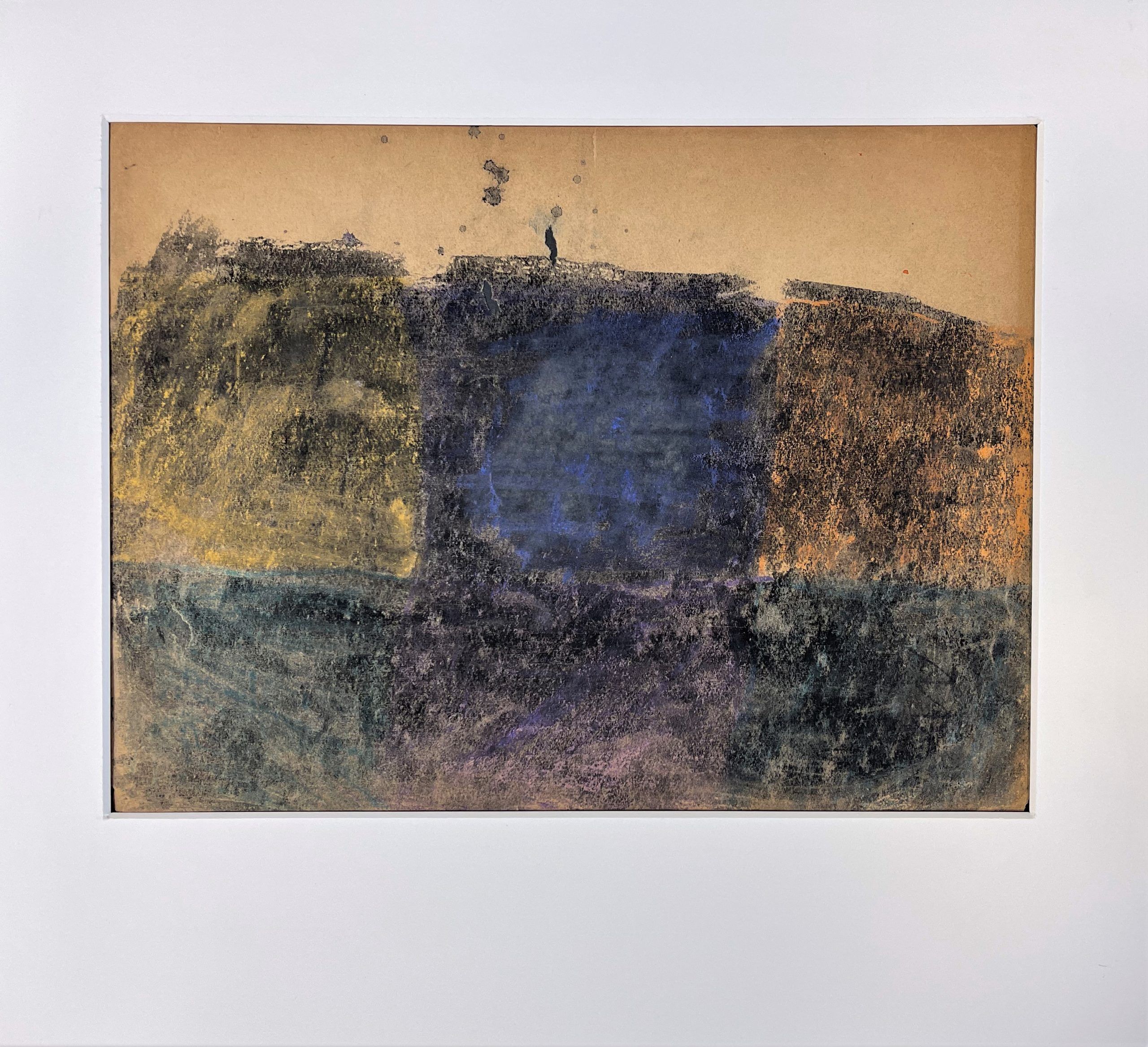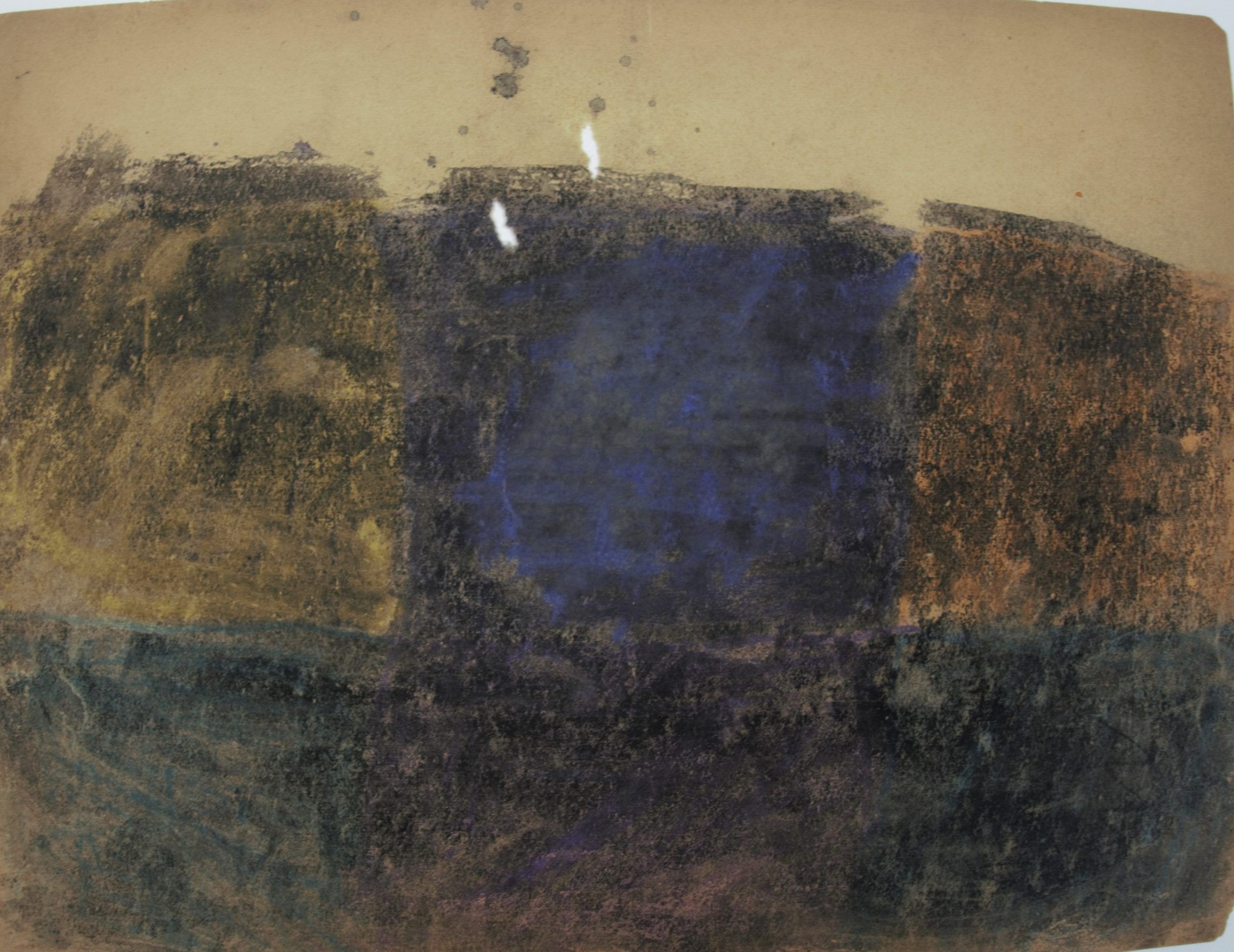 This work is a geometric construction consisting of three squares surmounting a rectangular bas, executed in oil pastels which nearly but do not quite obscure gestural markings hidden in the blocks.