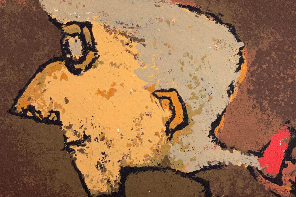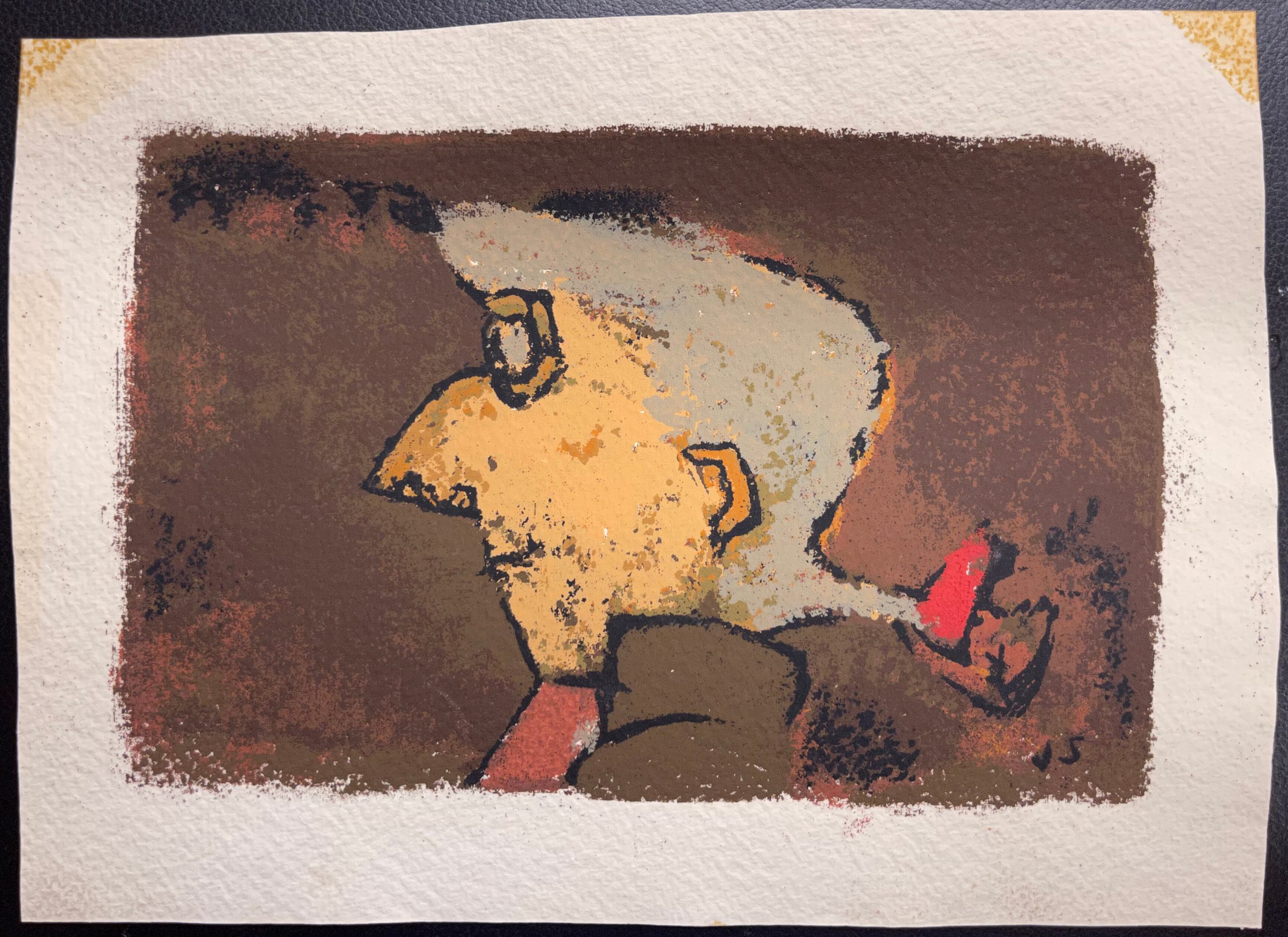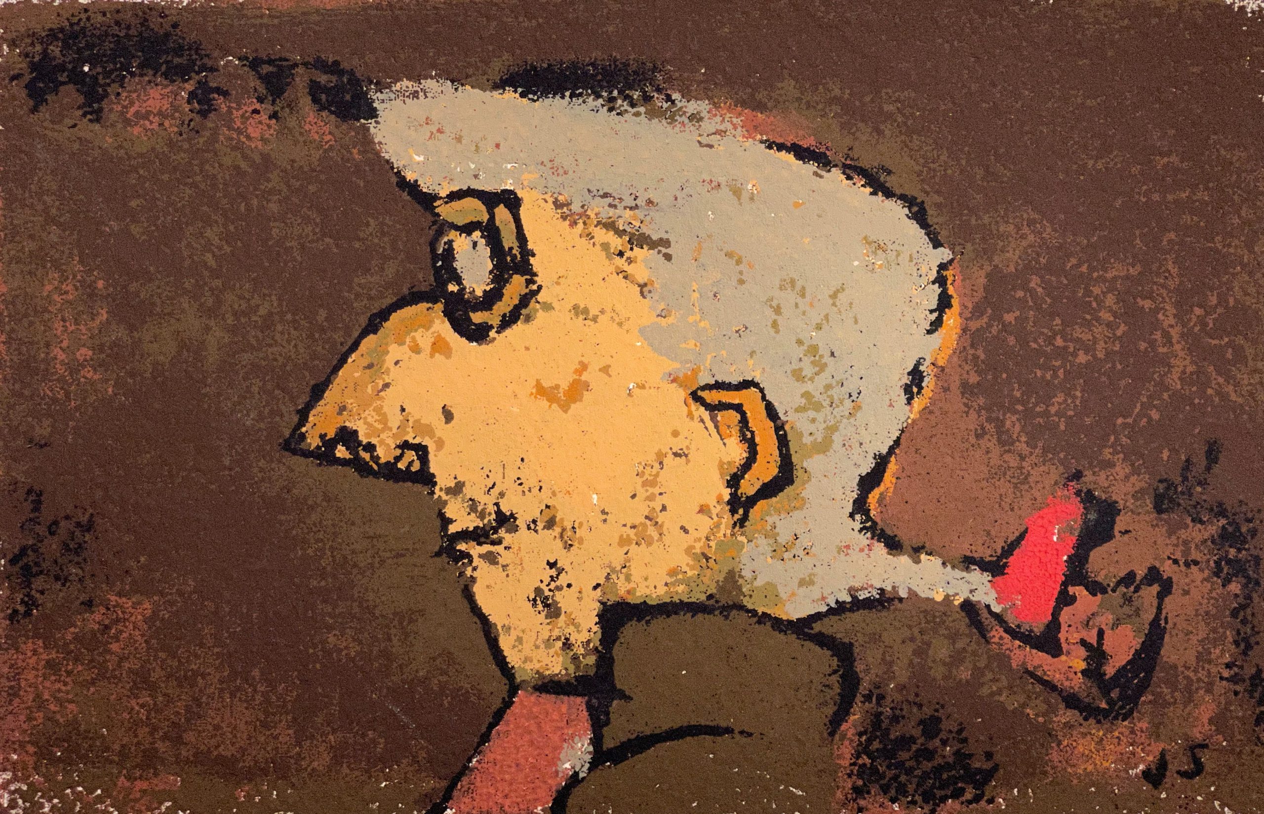 Silkscreen (serigraph) in multiple colors on dark brown background, printed on fine artist’s paper.