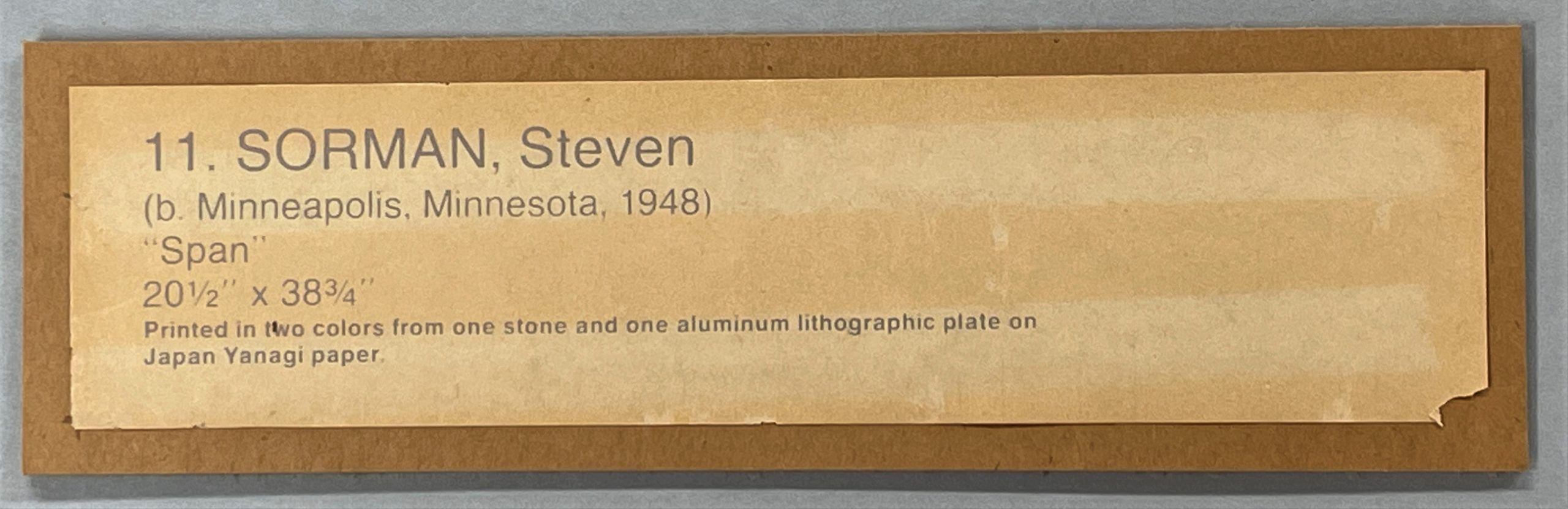 Steven Sorman was commissioned to produce this work as part of a project sponsored by Northwestern National Bank of Minneapolis to support and promote the visual arts. Fifteen works by fifteen artists were commissioned, each of which was printed by the artist working alongside master printer Steven M. Andersen.