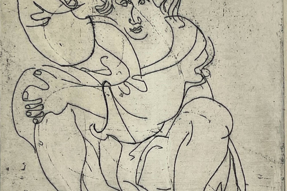With spare lines and sure curves resembling the work of Stanley William Hayter, this portrait by Hertha Spielberg of a seated woman is beautiful and interesting.