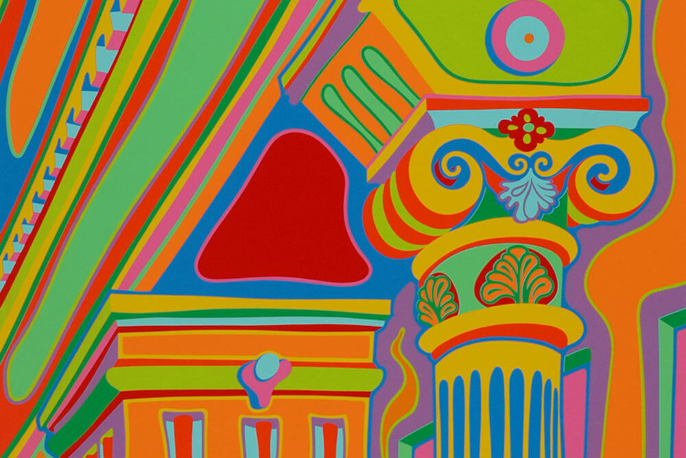 Clayton Pond’s “Capital Ideas” suite is a collection of seven serigraphs that Pond created during the spring, summer, and fall of 1974. Pond was one of the early artists to settle in the SoHo area of New York City, living in his Greene Street studio from 1969 to 1995. He watched as the area changed from a low-rent warehouse district to a dynamic center of the arts. What remained unchanged over those decades was the 100-year-old architecture of SoHo’s cast iron facades. Pond commemorated the beauty of the cast iron architectural details—enhancing them in his colorful way, of course. Every one of the images in the suite is from what Pond could see from the front windows and fire escape of his studio.