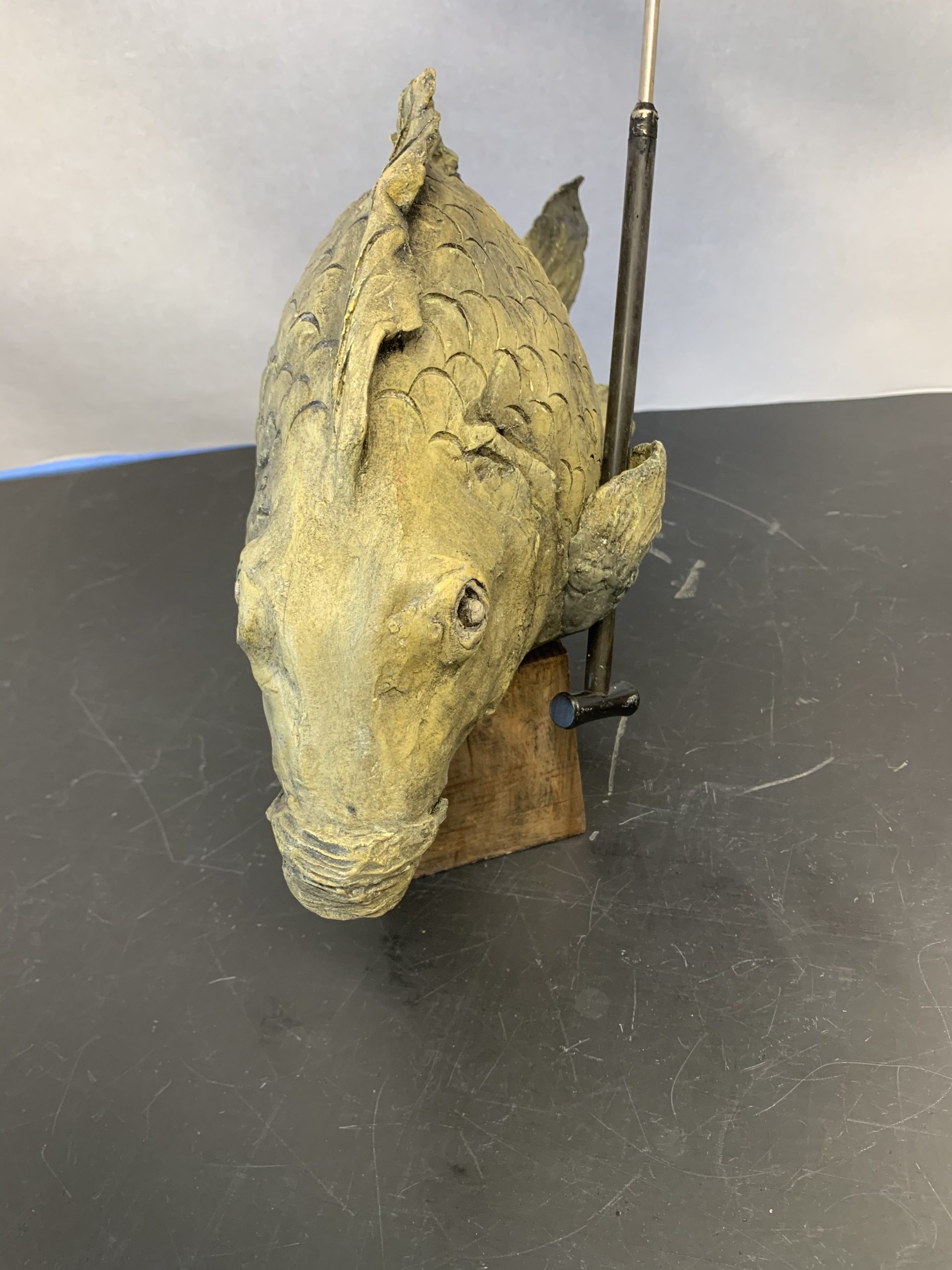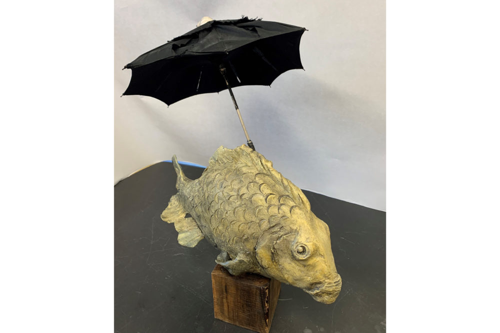 Cheryl Lichwell was fascinated with the way people protect themselves–not so much from physical harm as from emotional harm, whether real or perceived. Here, our fish is staying dry. With warmth and humor and great technical skill, Lichwell has created a remarkably expressive sculpture.