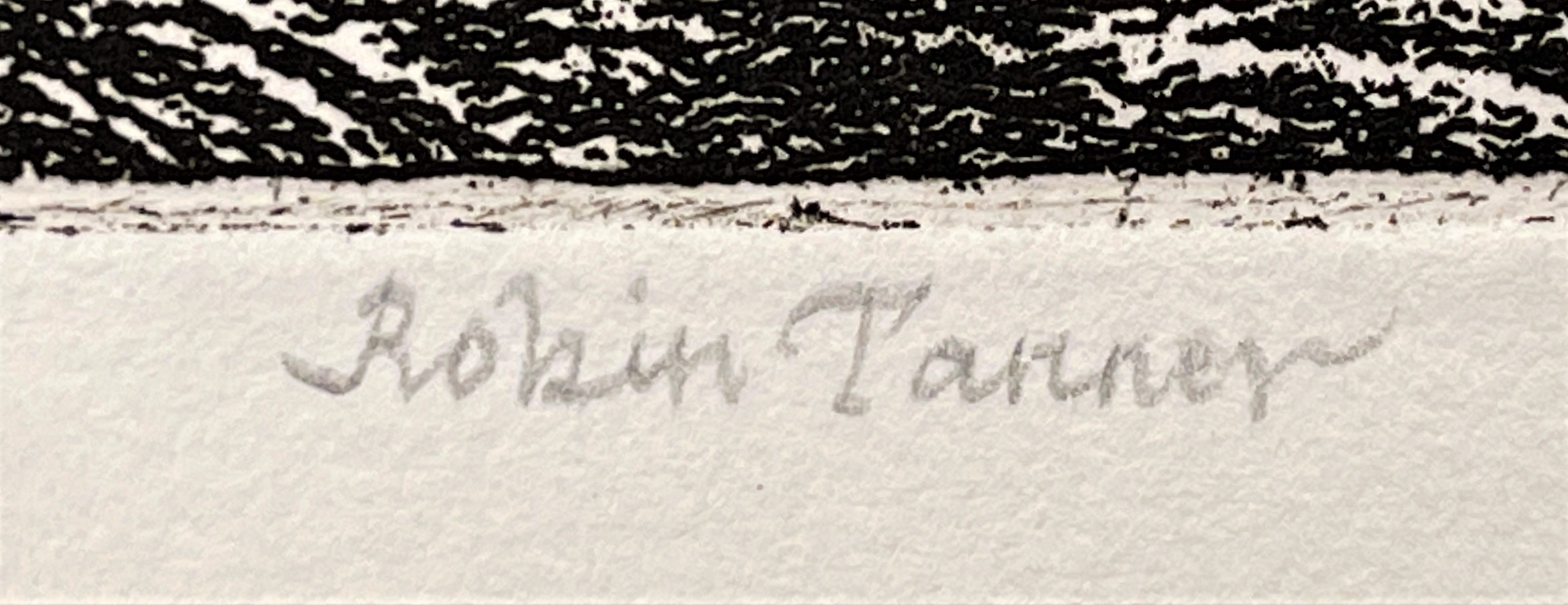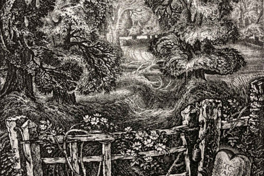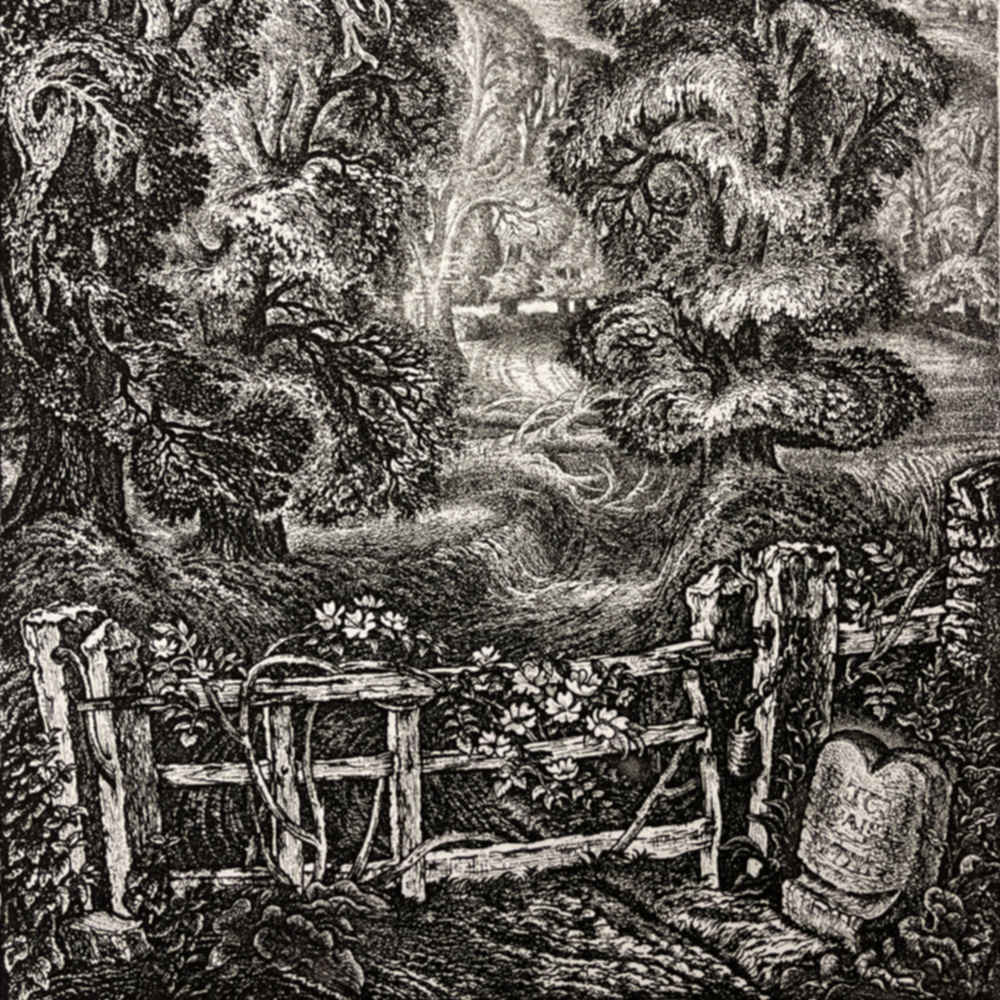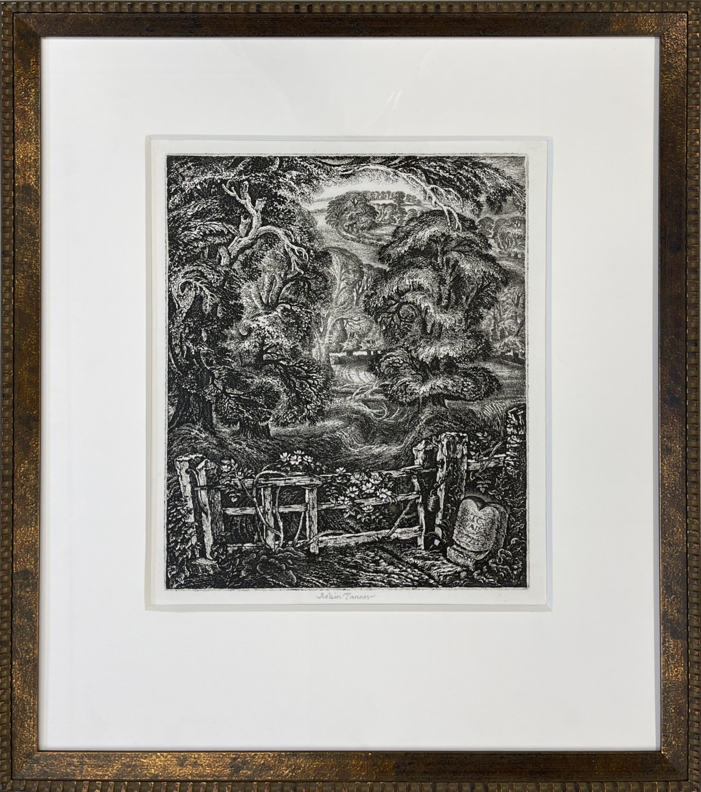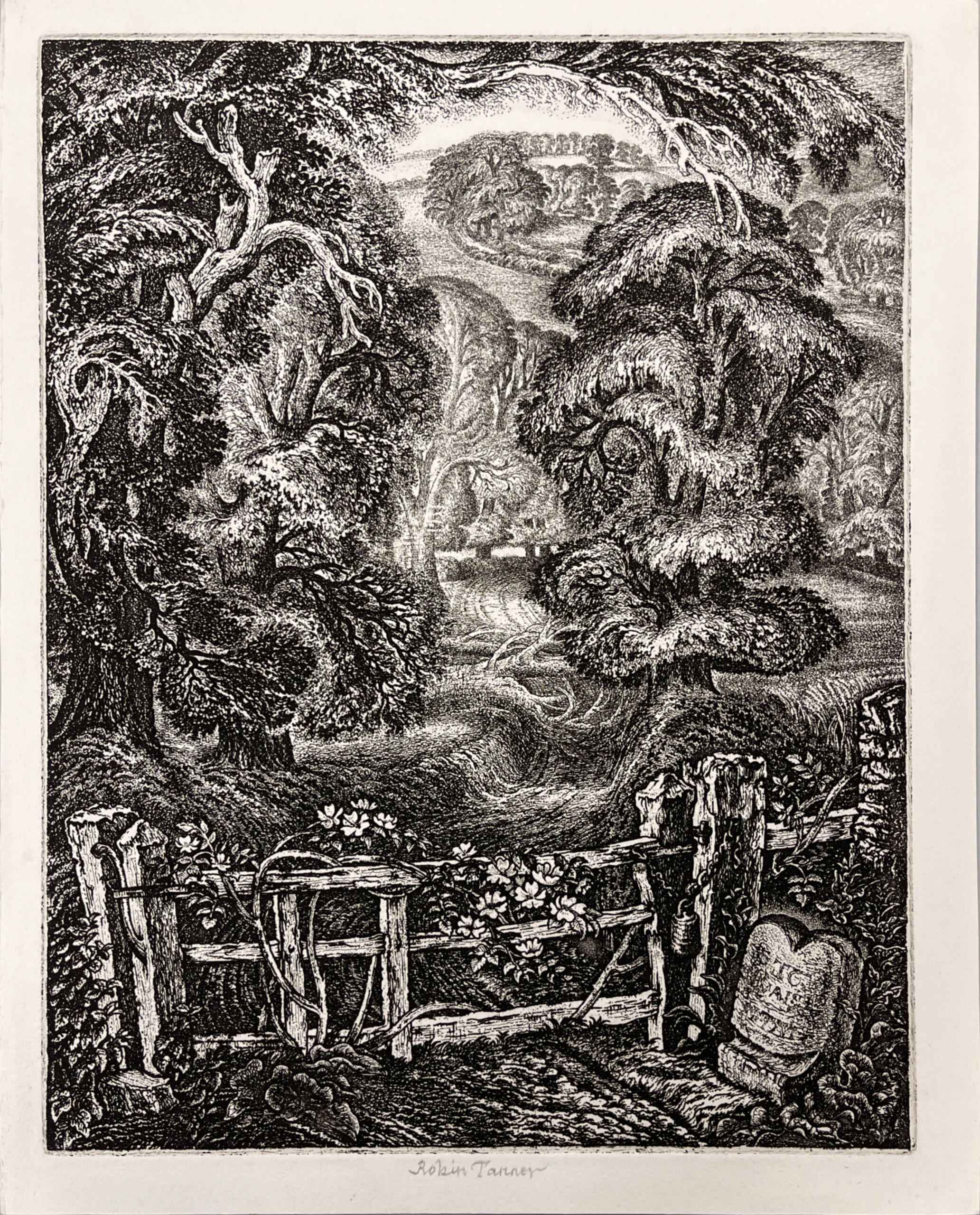 Robin Tanner began working on this etching in 1974 when the Dutch Elm disease was considerably advanced. This plate is a lament for the Dutch Elm—and a celebration of the 17th Century poet Thomas Traherne’s line, “Everything was at rest, free and immortal.” The gateway overgrown with dog-roses is similar to that used in Tanner’s earlier work, Martin’s Hovel, and the milestone is from one at the Wiltshire village of Sutton Benger.