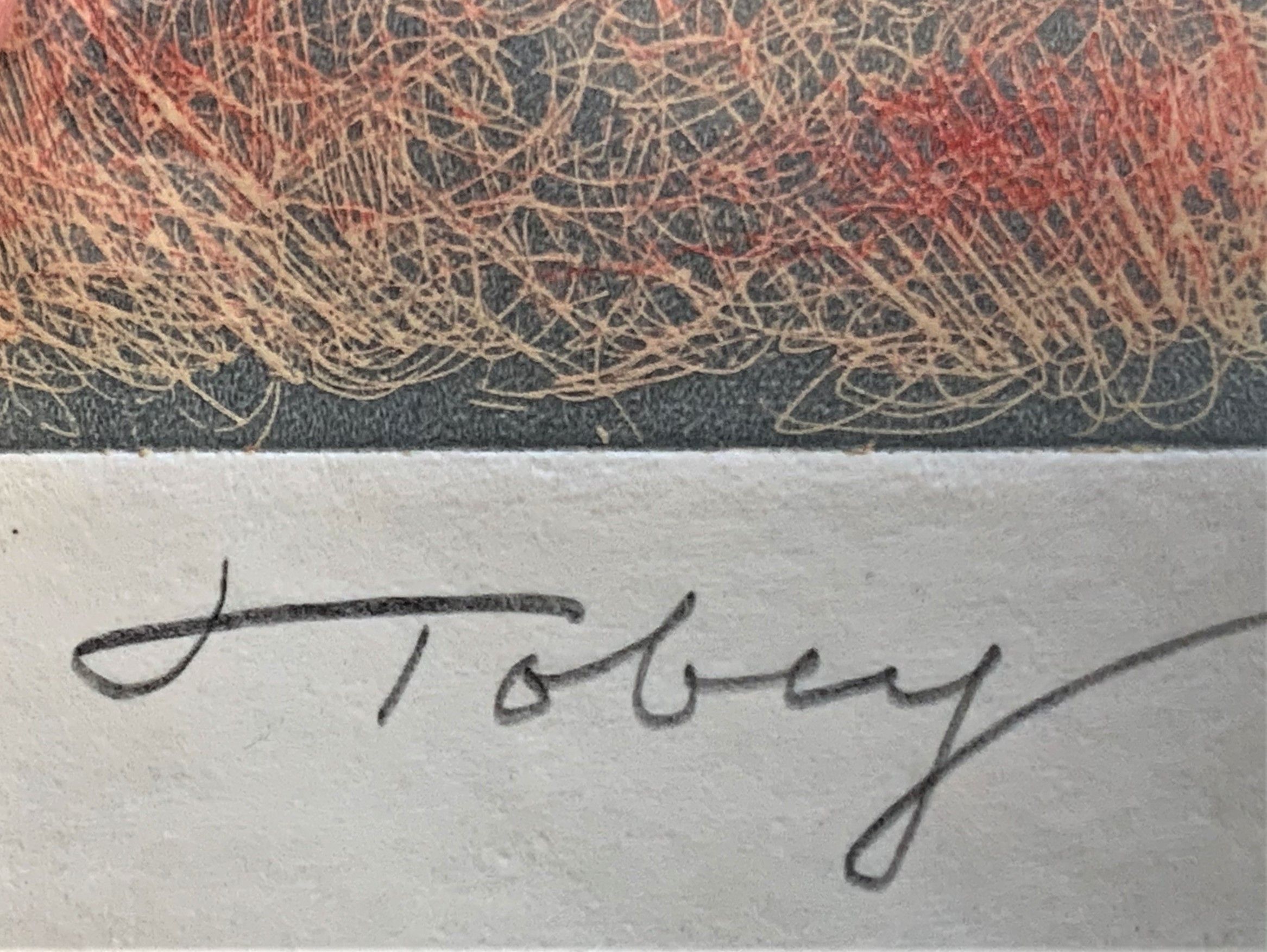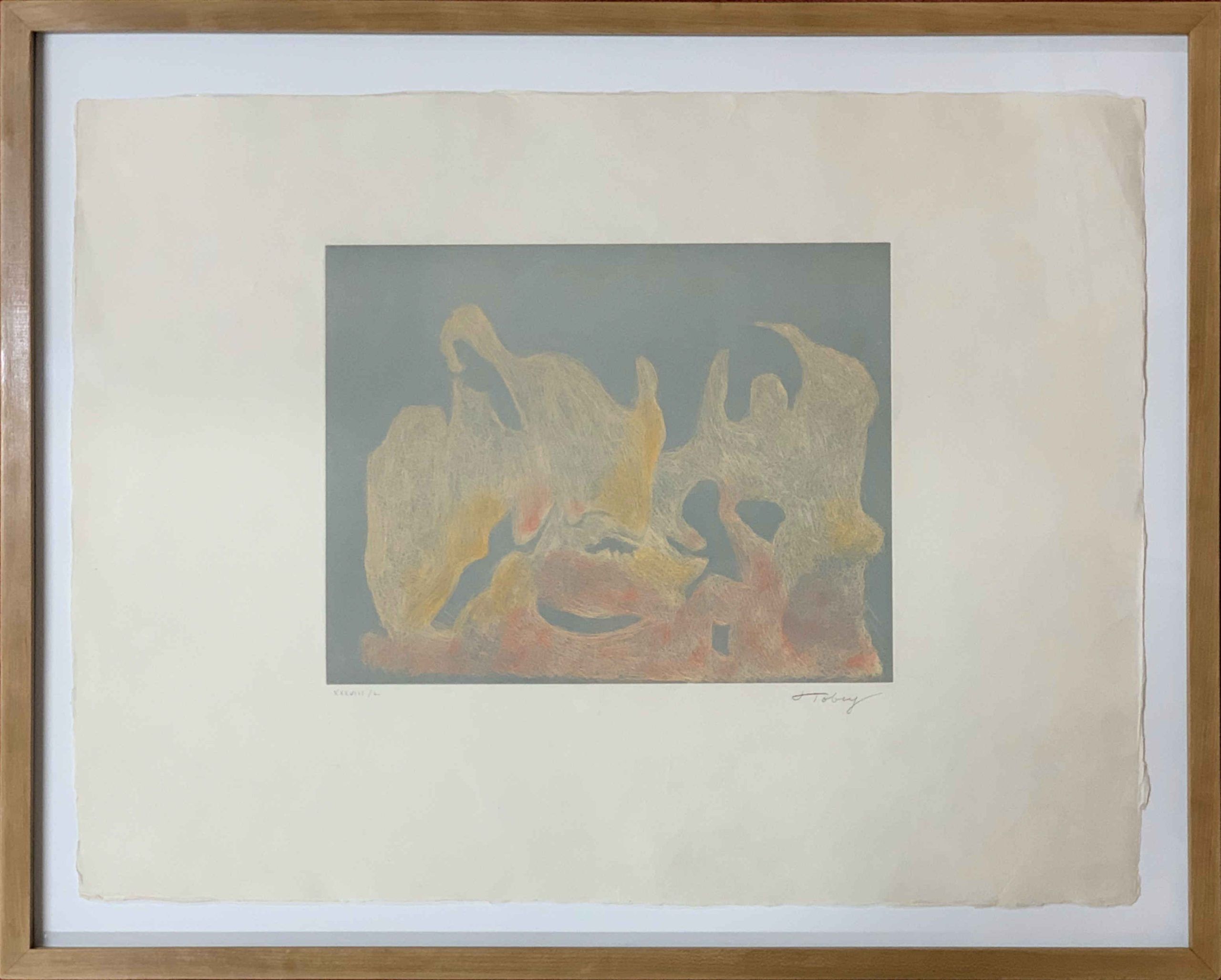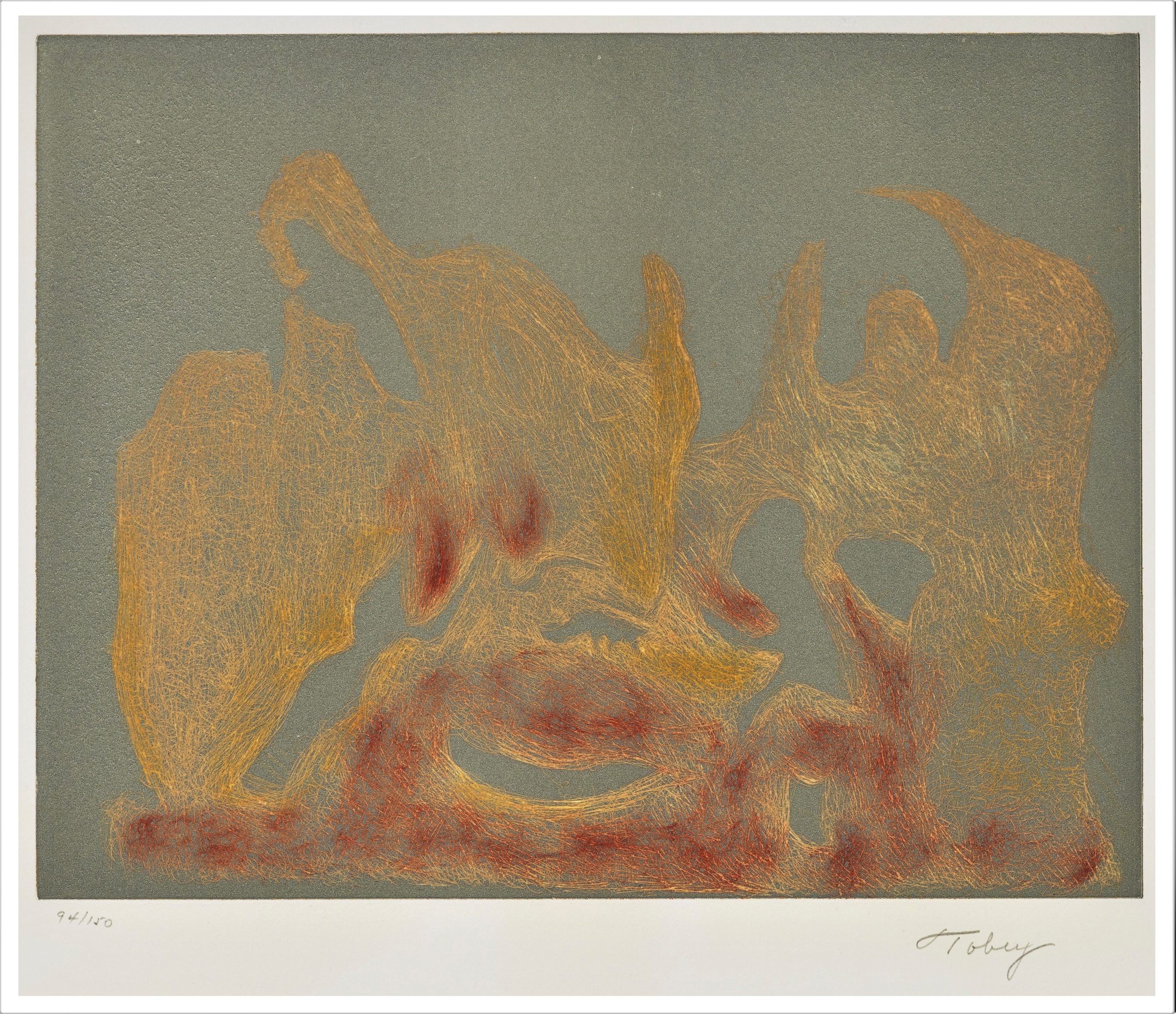 A modern print by the master printmaker Mark Tobey depicting an abstract organic-shaped textured white sculptural mass on black ground.