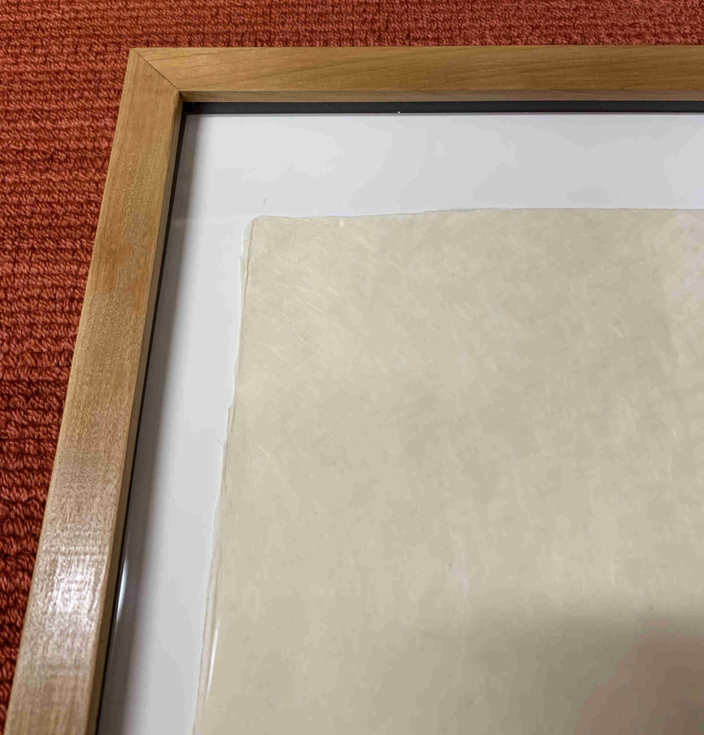 This work is floated and custom framed in a solid cherry frame behind 99% UV-Filtering Plexiglass. The glazing is lifted off the work with spacers. Framed with all conservation materials.