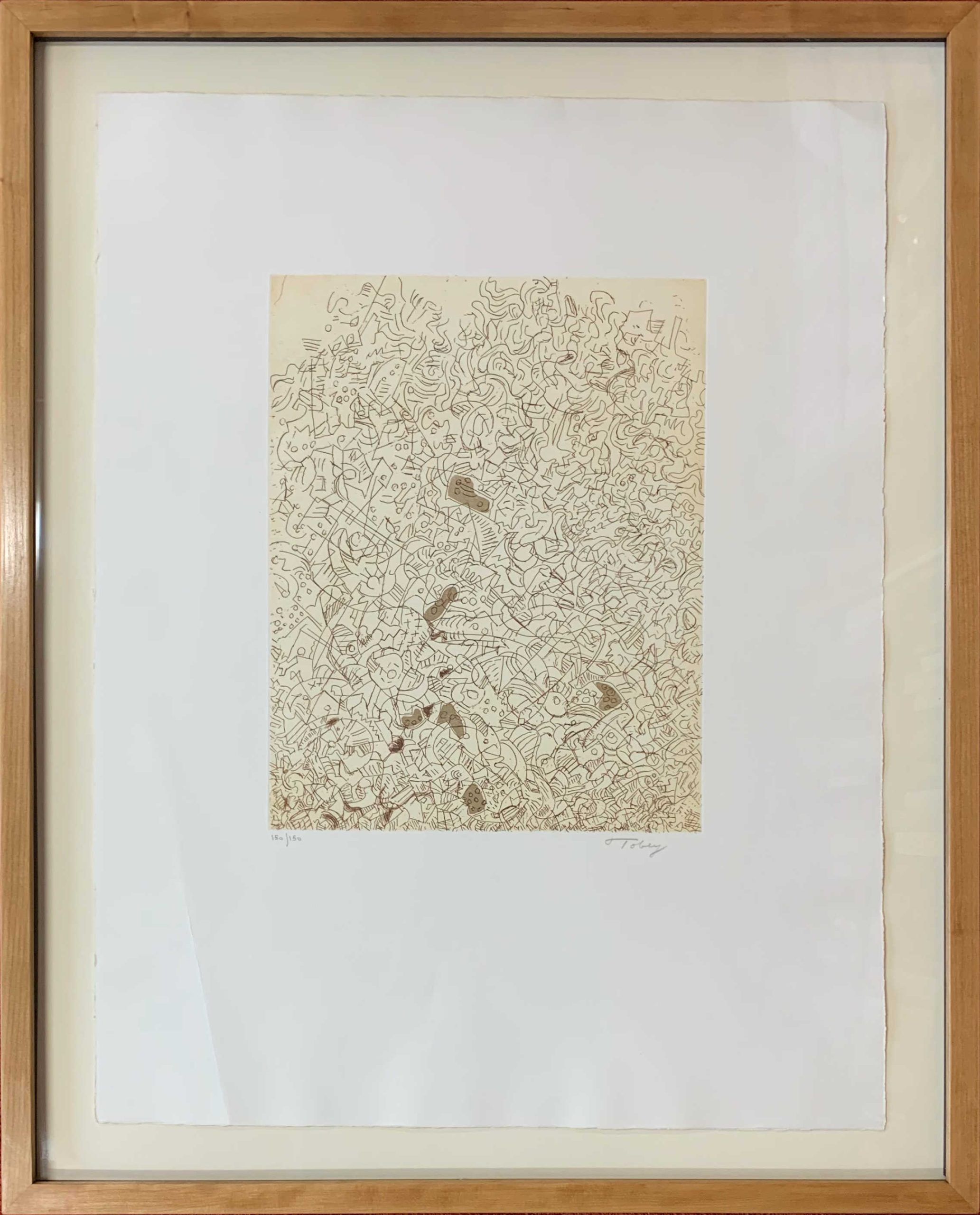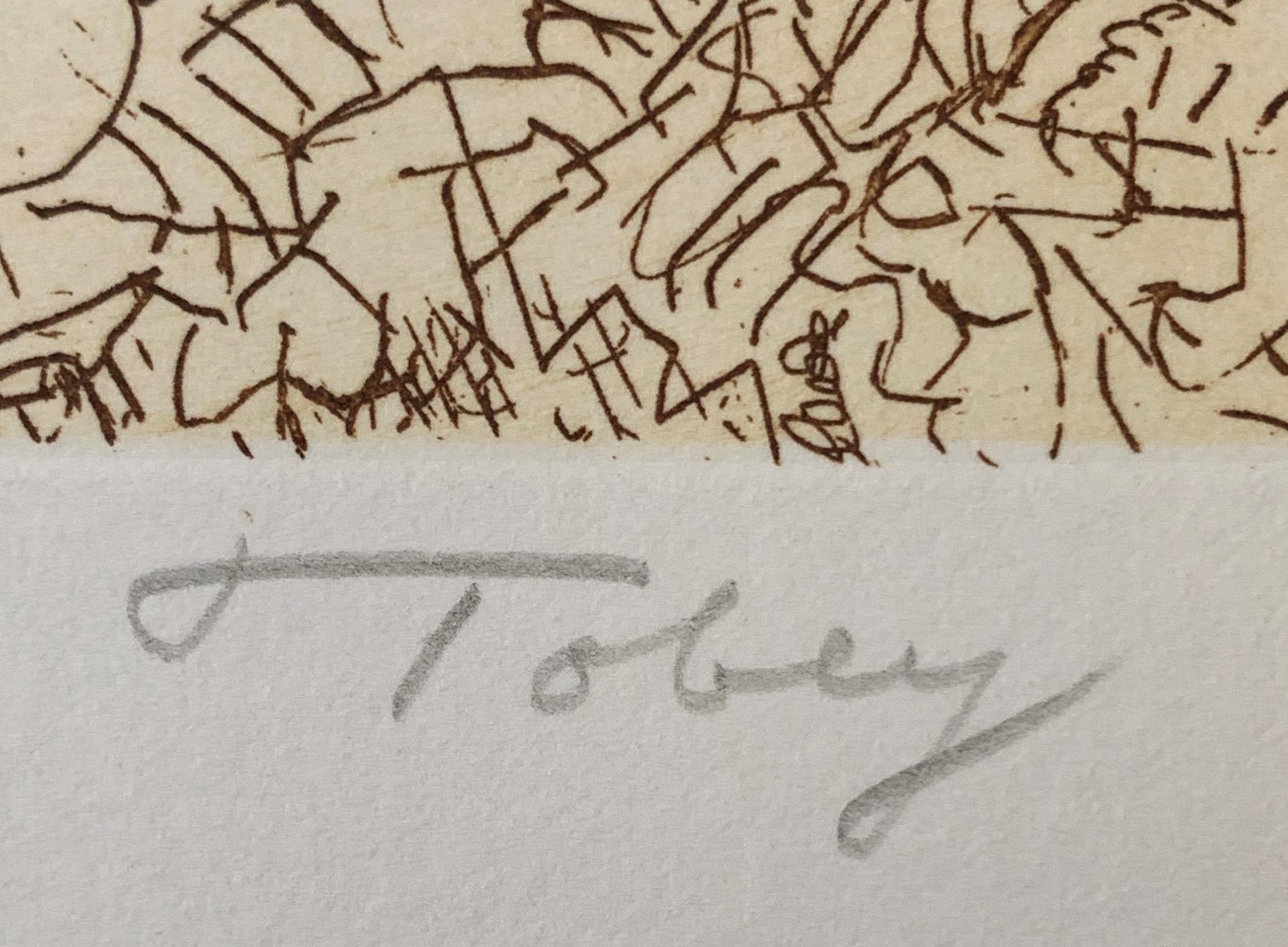 In the late 1930s, Tobey developed a style of work that used the layering of numerous transparent and opaque brushstrokes within the composition. Initially, the lines were part of a figurative composition that highlighted realistic elements.  Eventually, though, the technique evolved into an inward type of meditative abstraction that covered the entire composition.  This style marked an important development in abstraction, highlighting the journey from true abstraction to the lines, shapes, colors, and light independently forming the work.