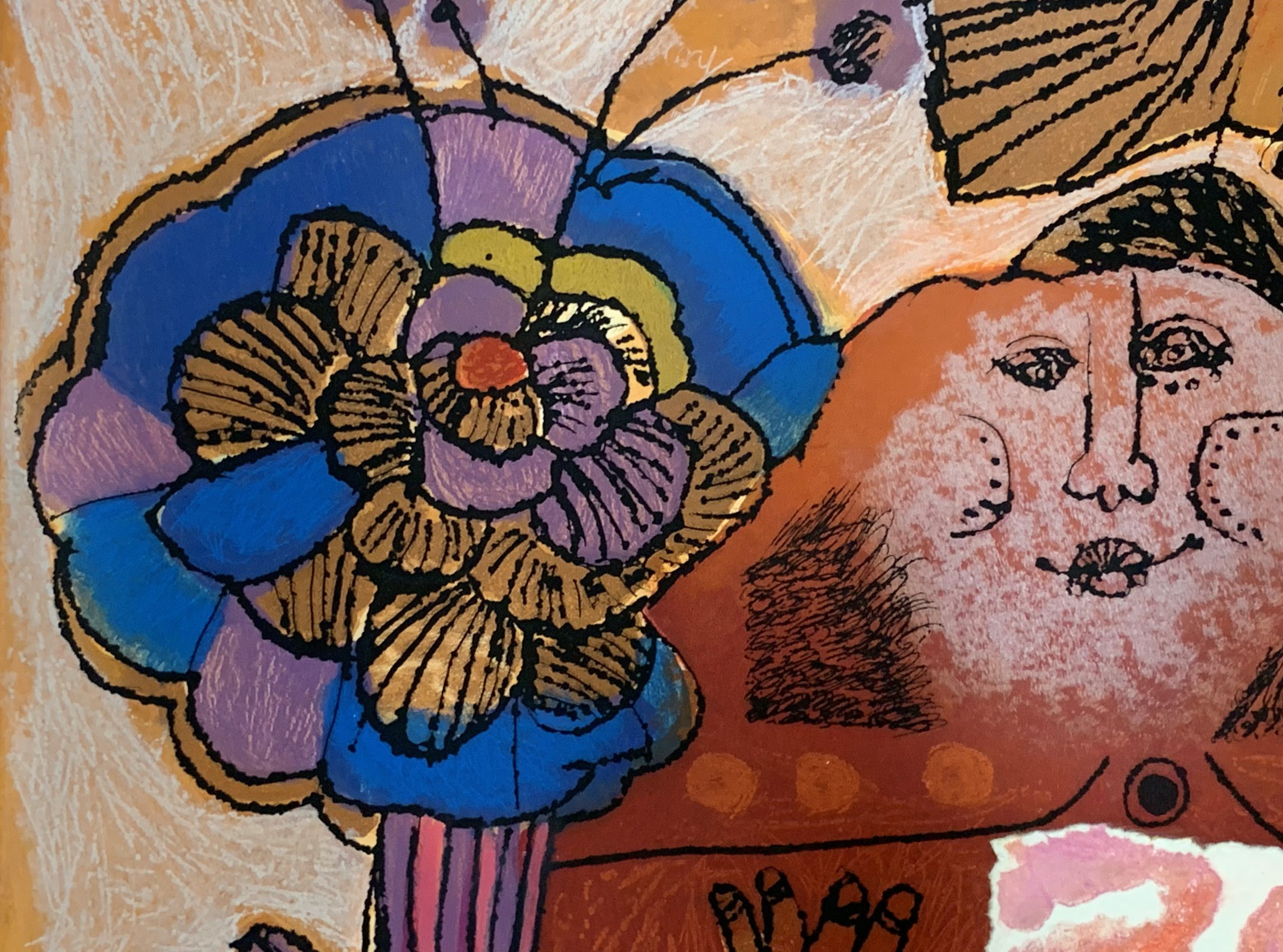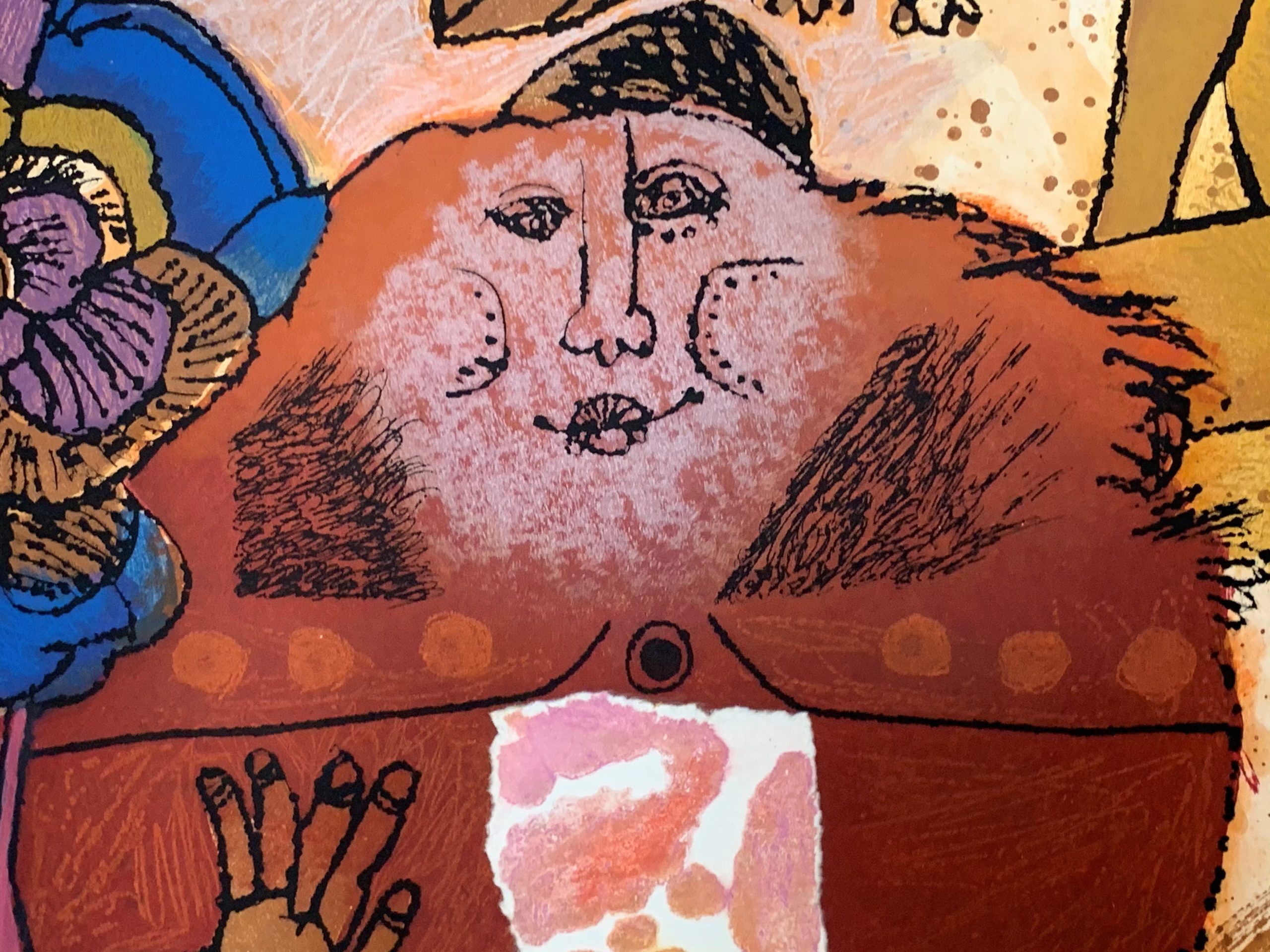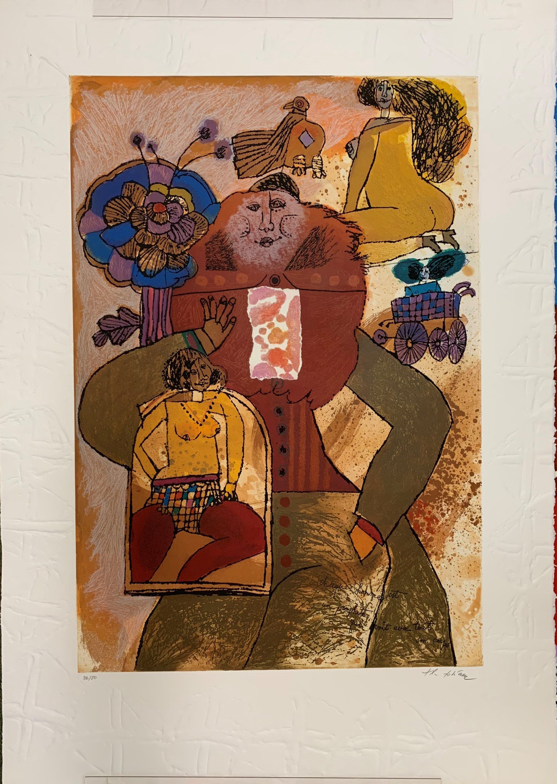 With deep, deep color, heavily-embossed paper, and magnificent scale, this work by Theo Tobiasse is dramatic, humorous, joyful, and beautiful.