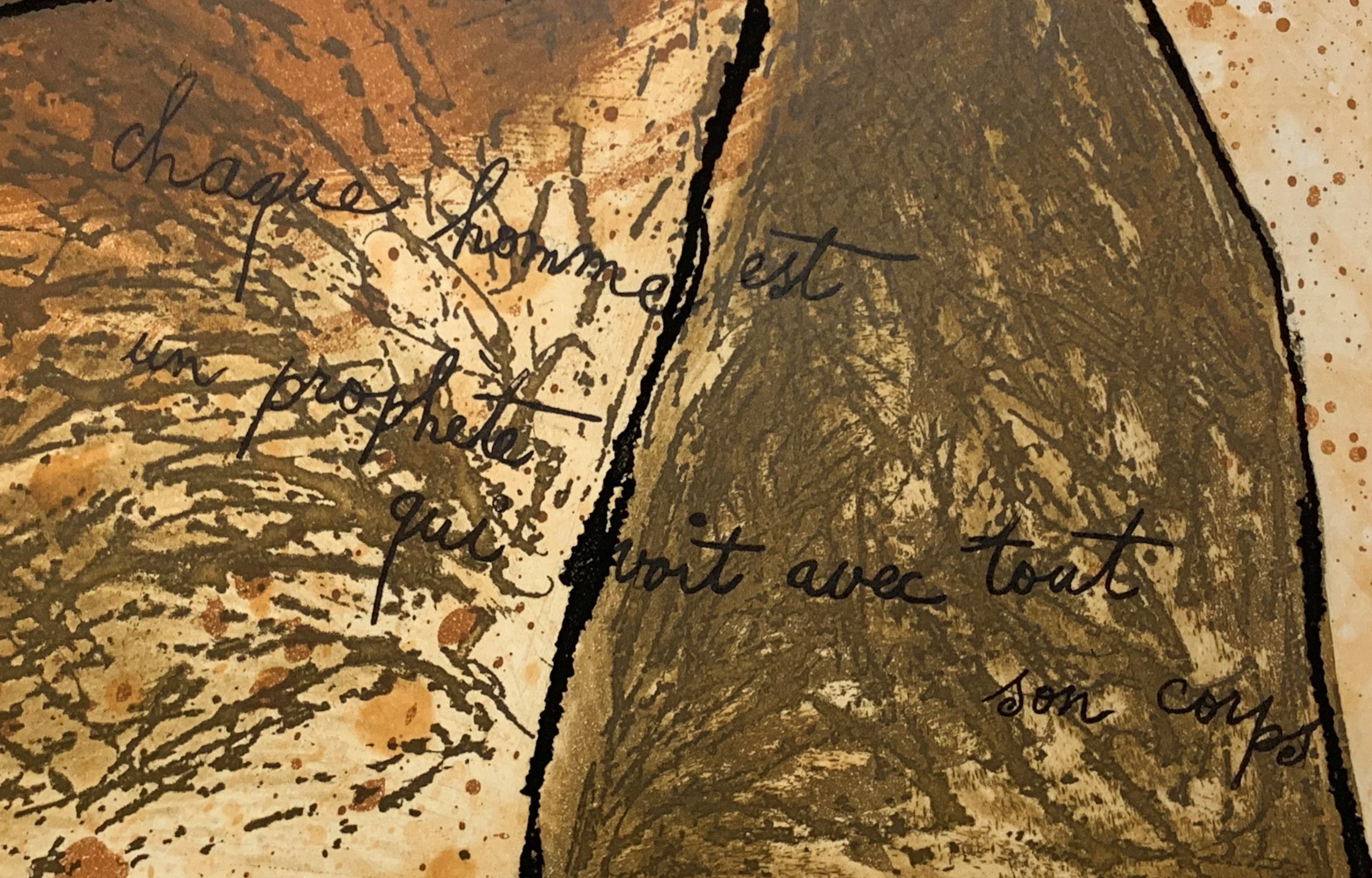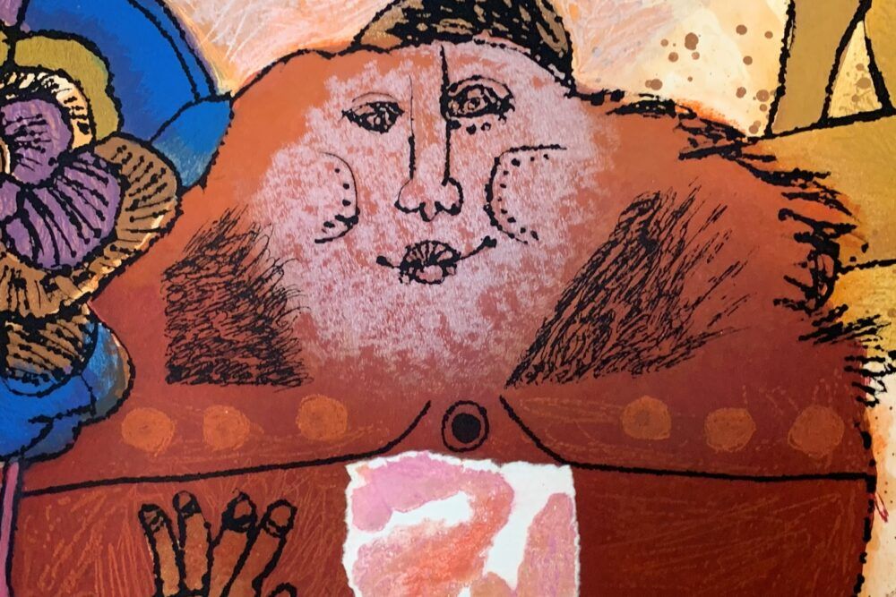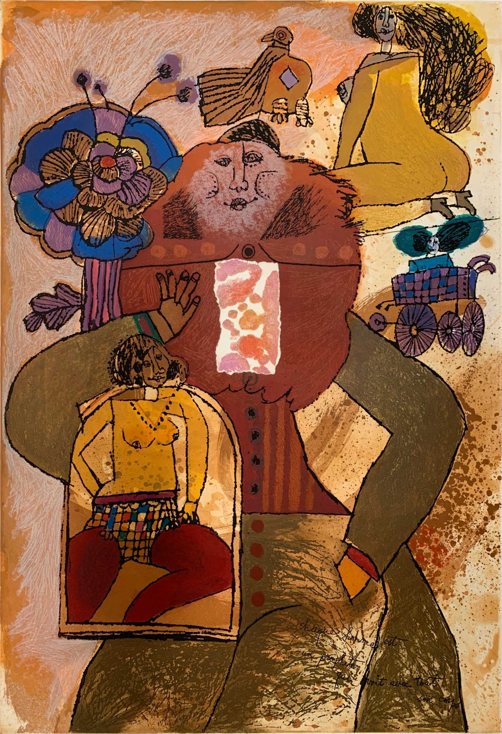 With deep, deep color, heavily-embossed paper, and magnificent scale, this work by Theo Tobiasse is dramatic, humorous, joyful, and beautiful.