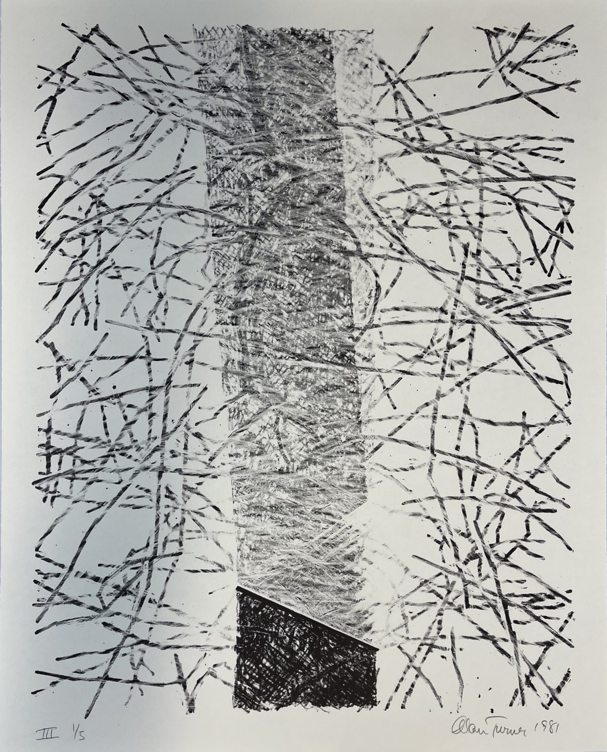 The third of three lithographs comprising the “A Pine Cut Down” series, one of Alan Turner’s famous commentaries on trees. Each picture stands alone, but together the three form a compelling triptych. This is the first of five Artist’s Proofs preceding the edition of 40. While the editioned prints are readily available, the artist’s proofs are rare.