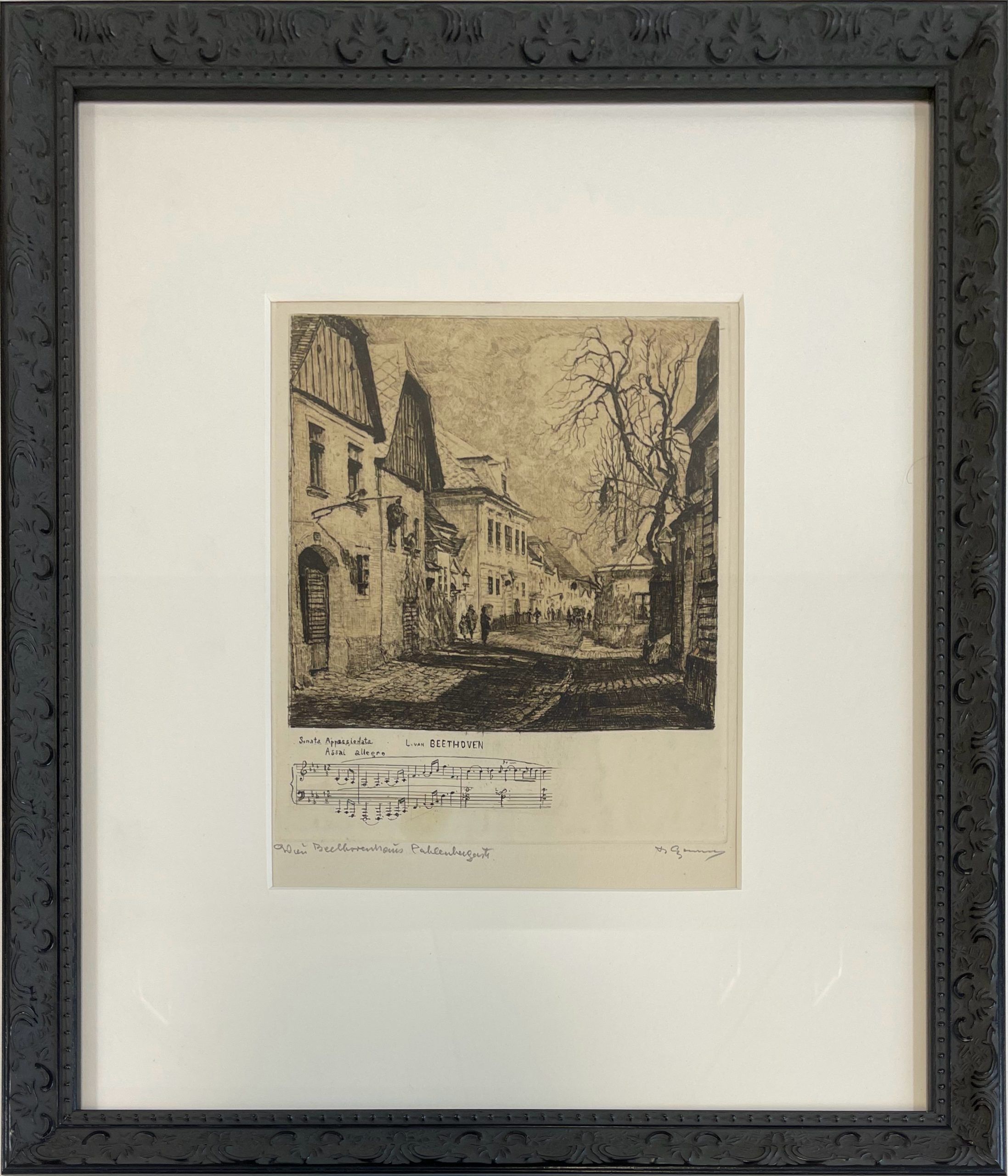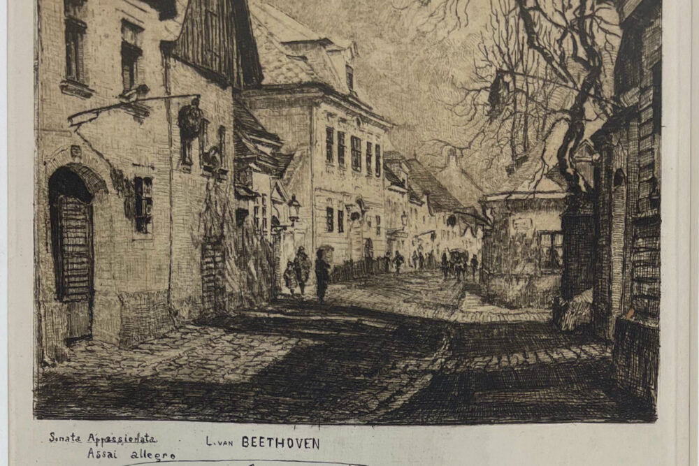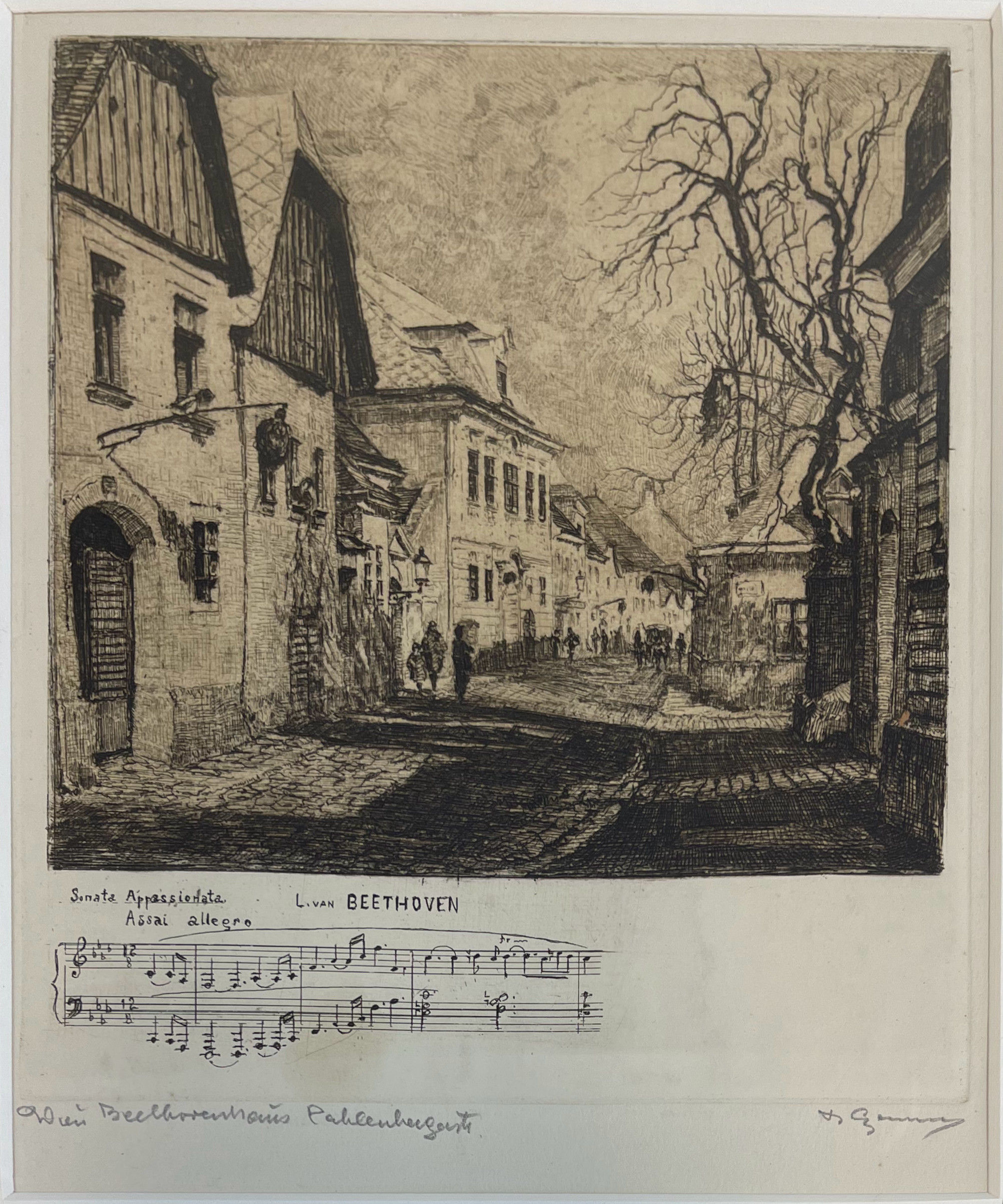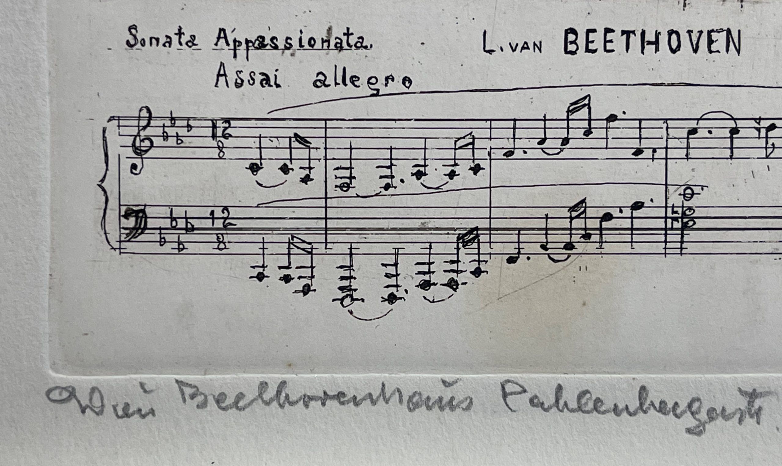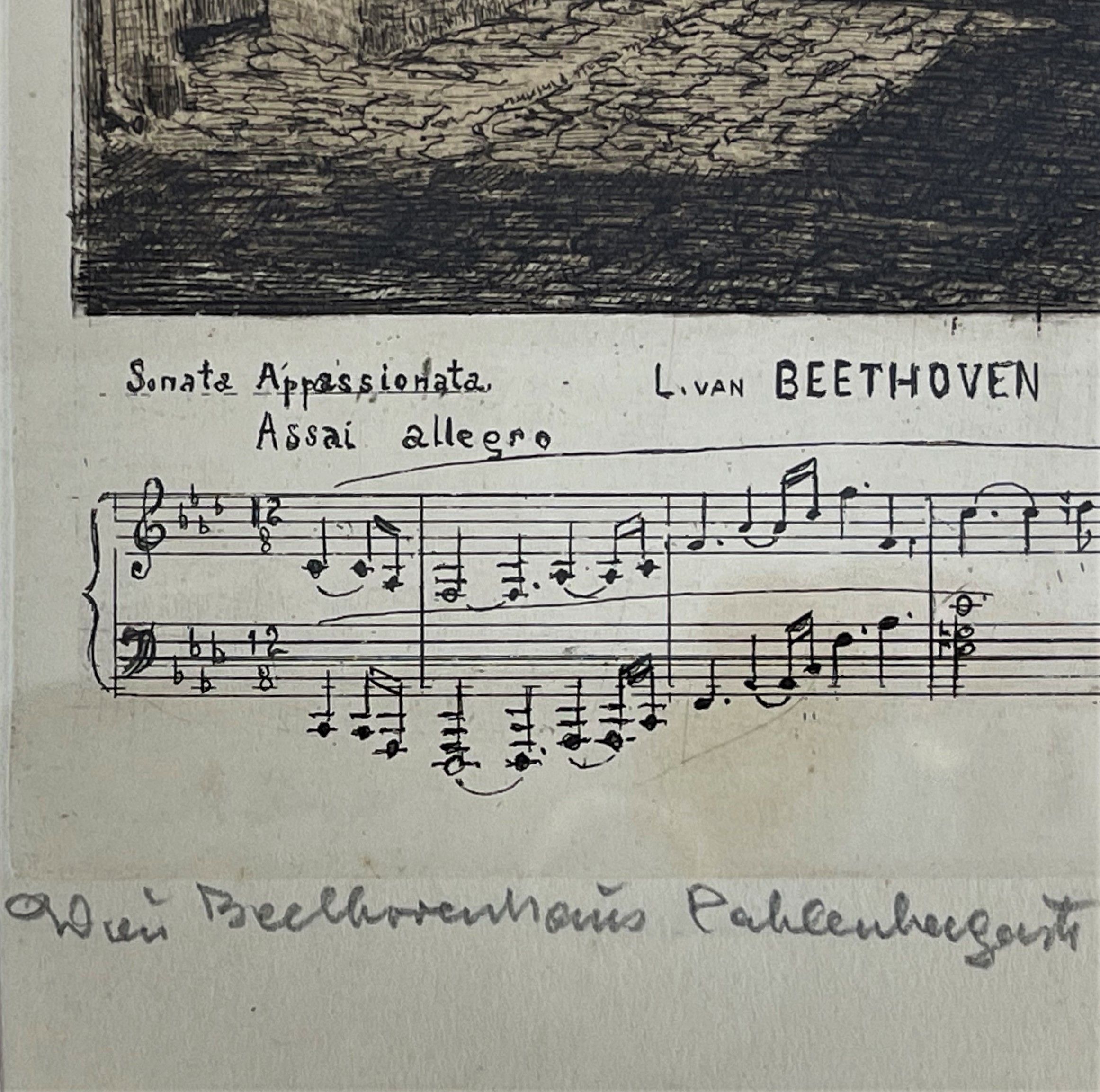 This work, by an unknown artist, shows the home of Ludwig van Beethoven, with a few bars of the Sonata Appassionata below.