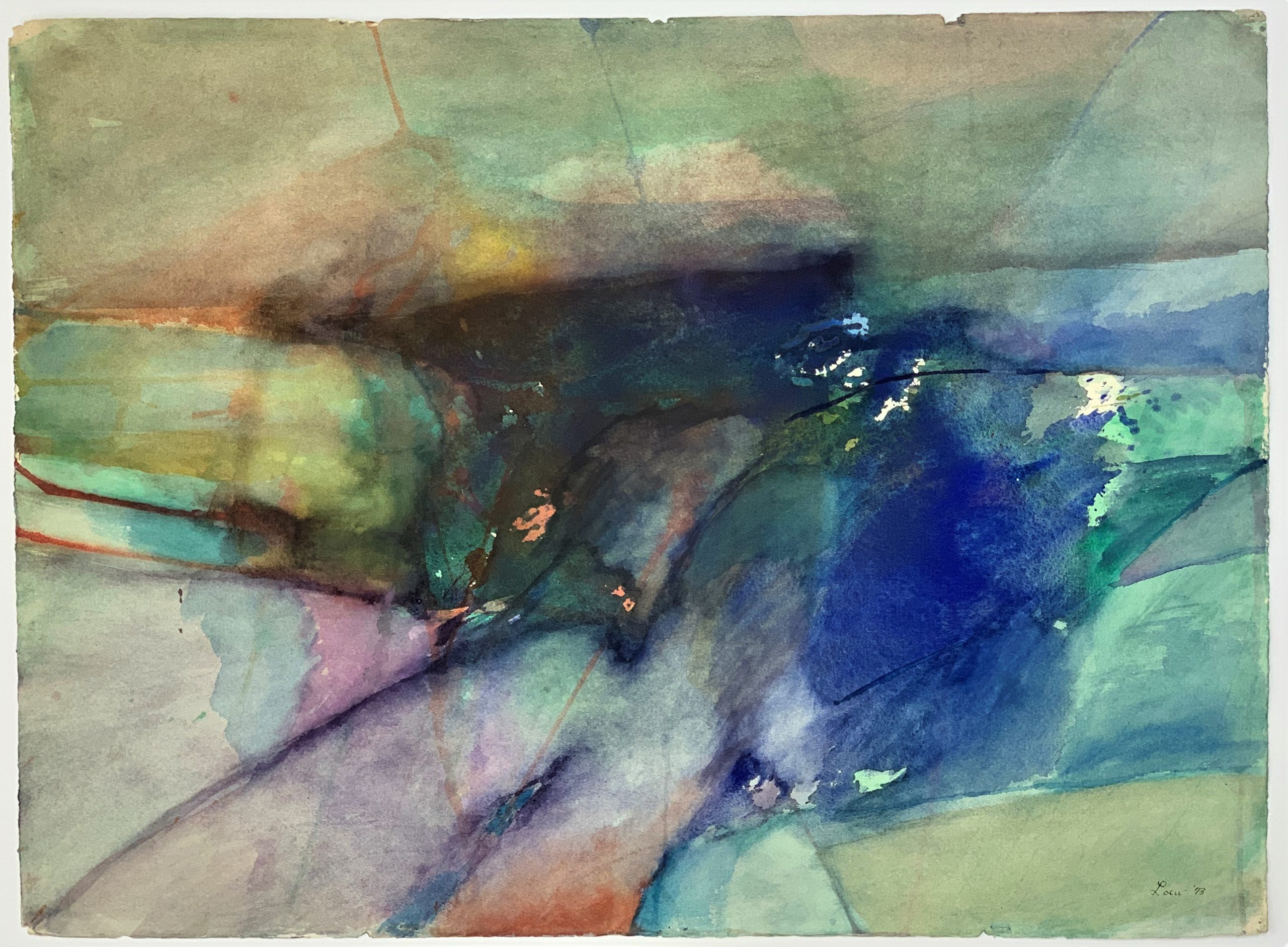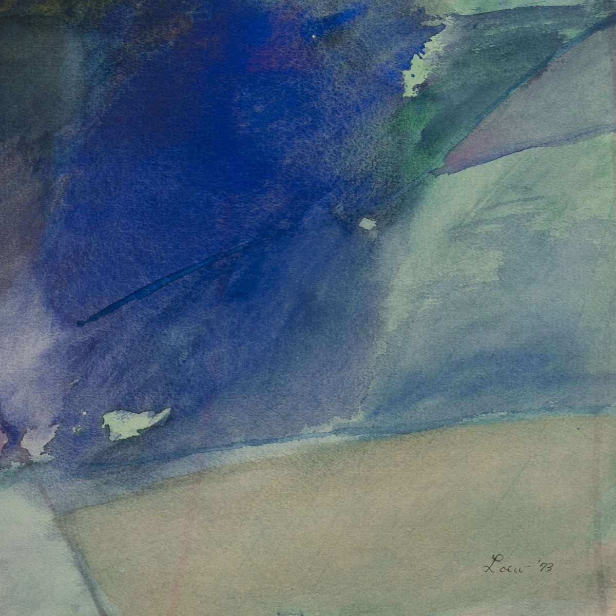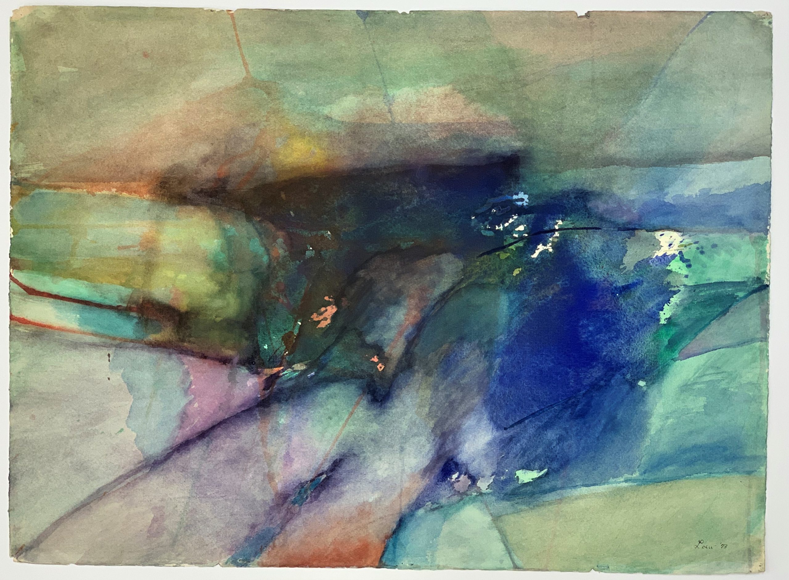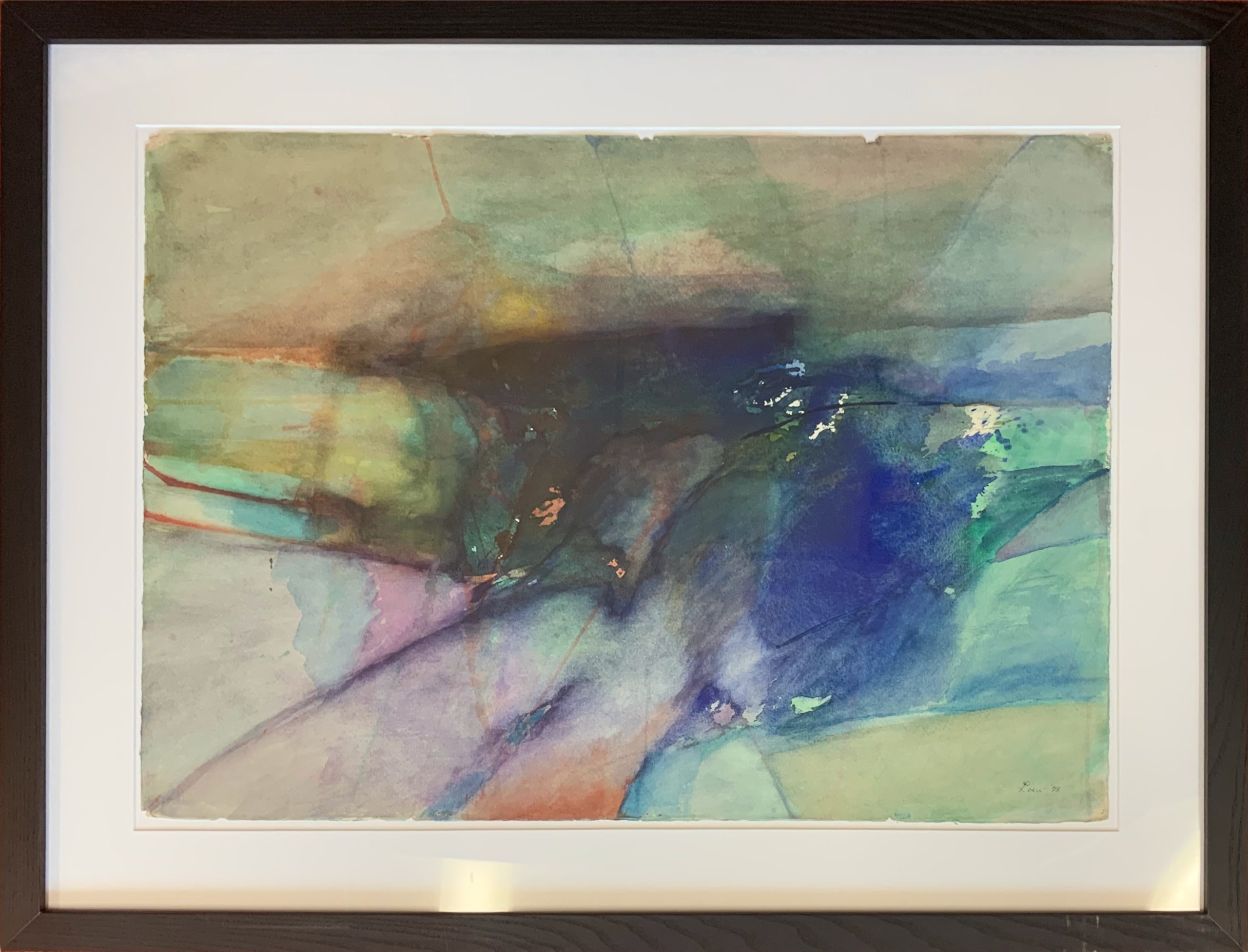 This watercolor, identified by Loew’s estate as 1970s, shows Loew at his best.  His use of colors across the palette—dark and brooding and soft and pastel—created an evocative and compelling work.  Loew is one of few abstractionists who paint abstractions of real items, though that is not always entirely clear to the viewer.