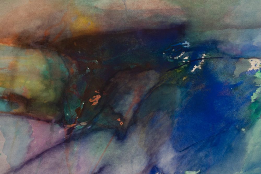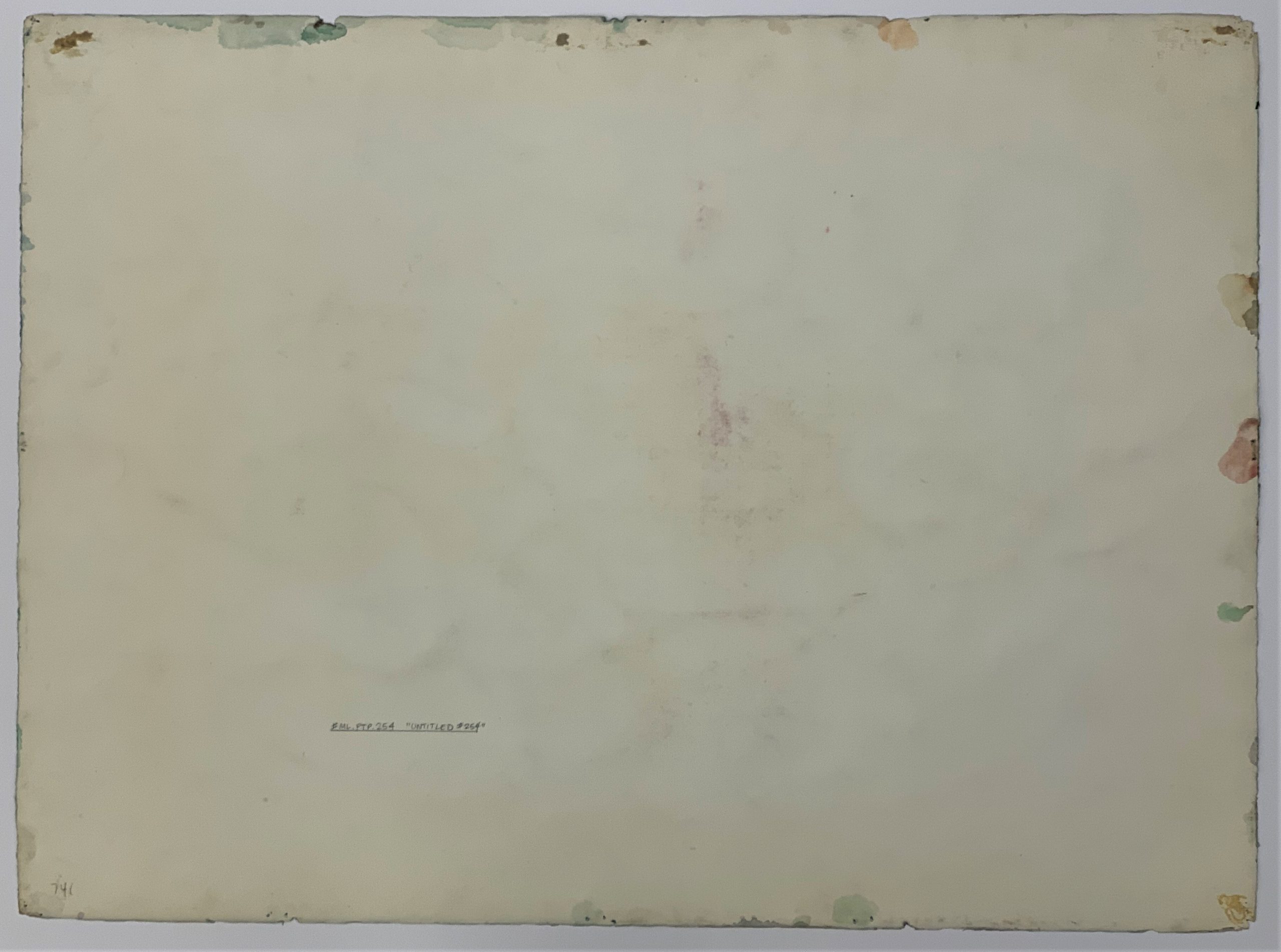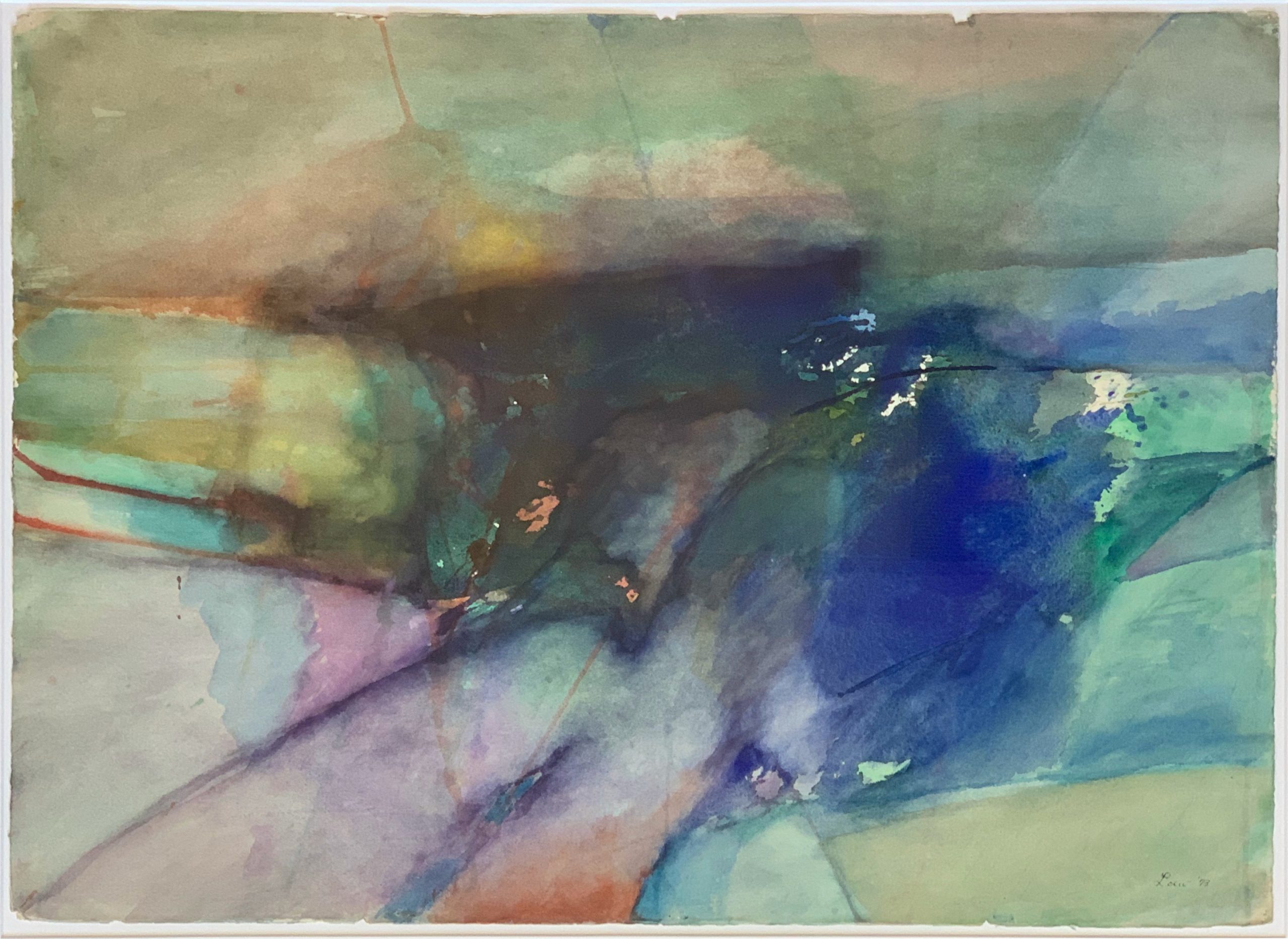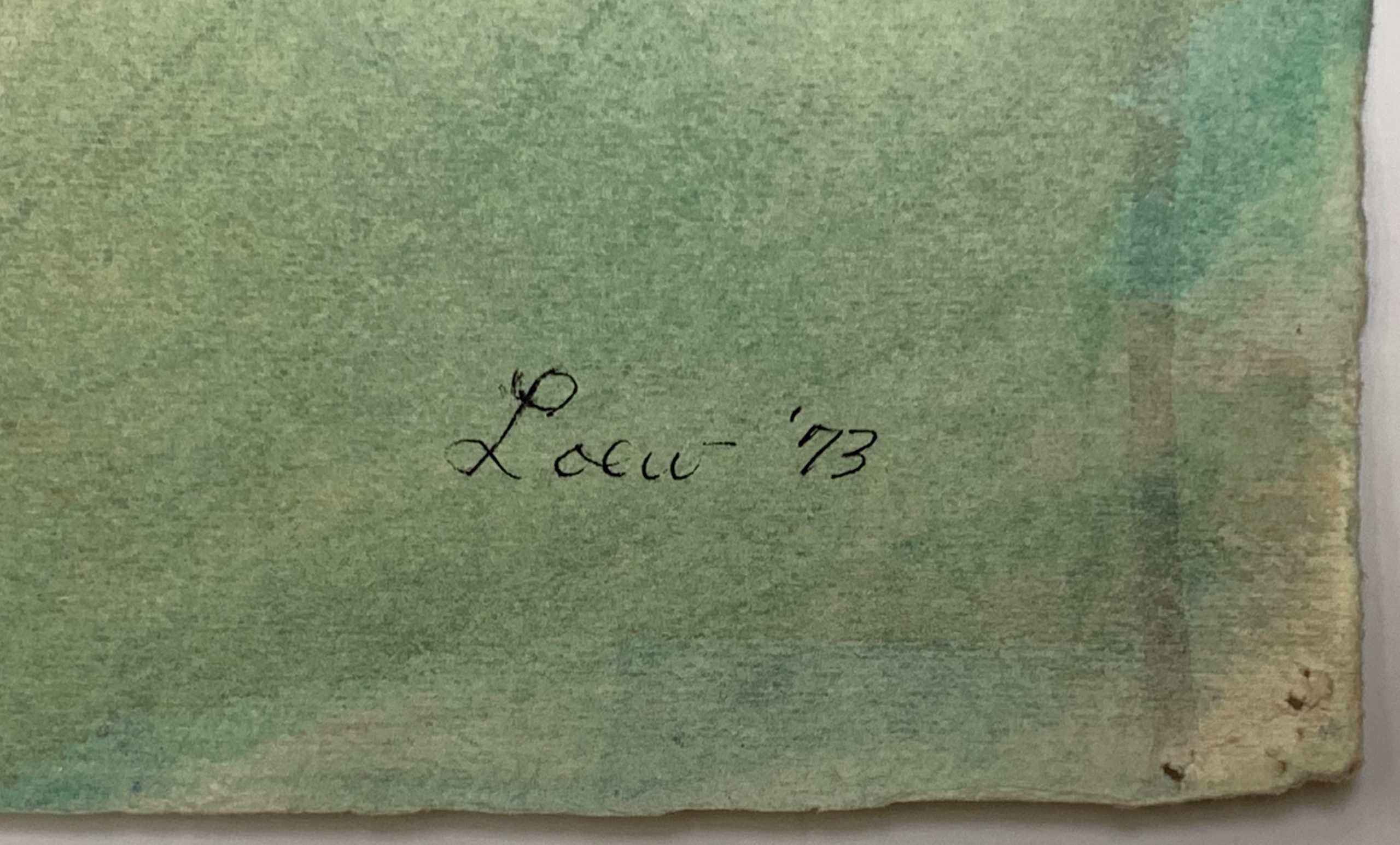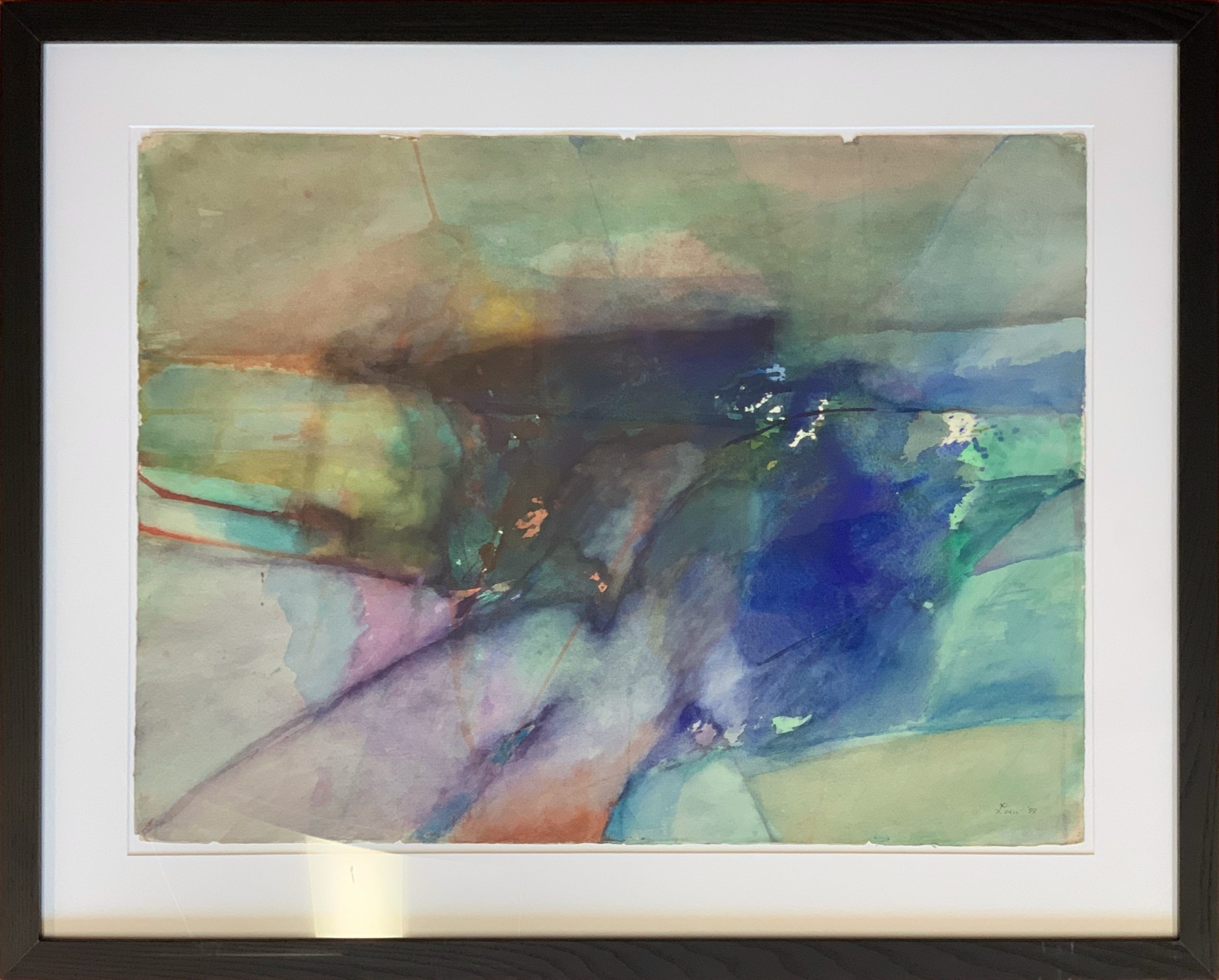 This watercolor, identified by Loew’s estate as 1970s, shows Loew at his best.  His use of colors across the palette—dark and brooding and soft and pastel—created an evocative and compelling work.  Loew is one of few abstractionists who paint abstractions of real items, though that is not always entirely clear to the viewer.