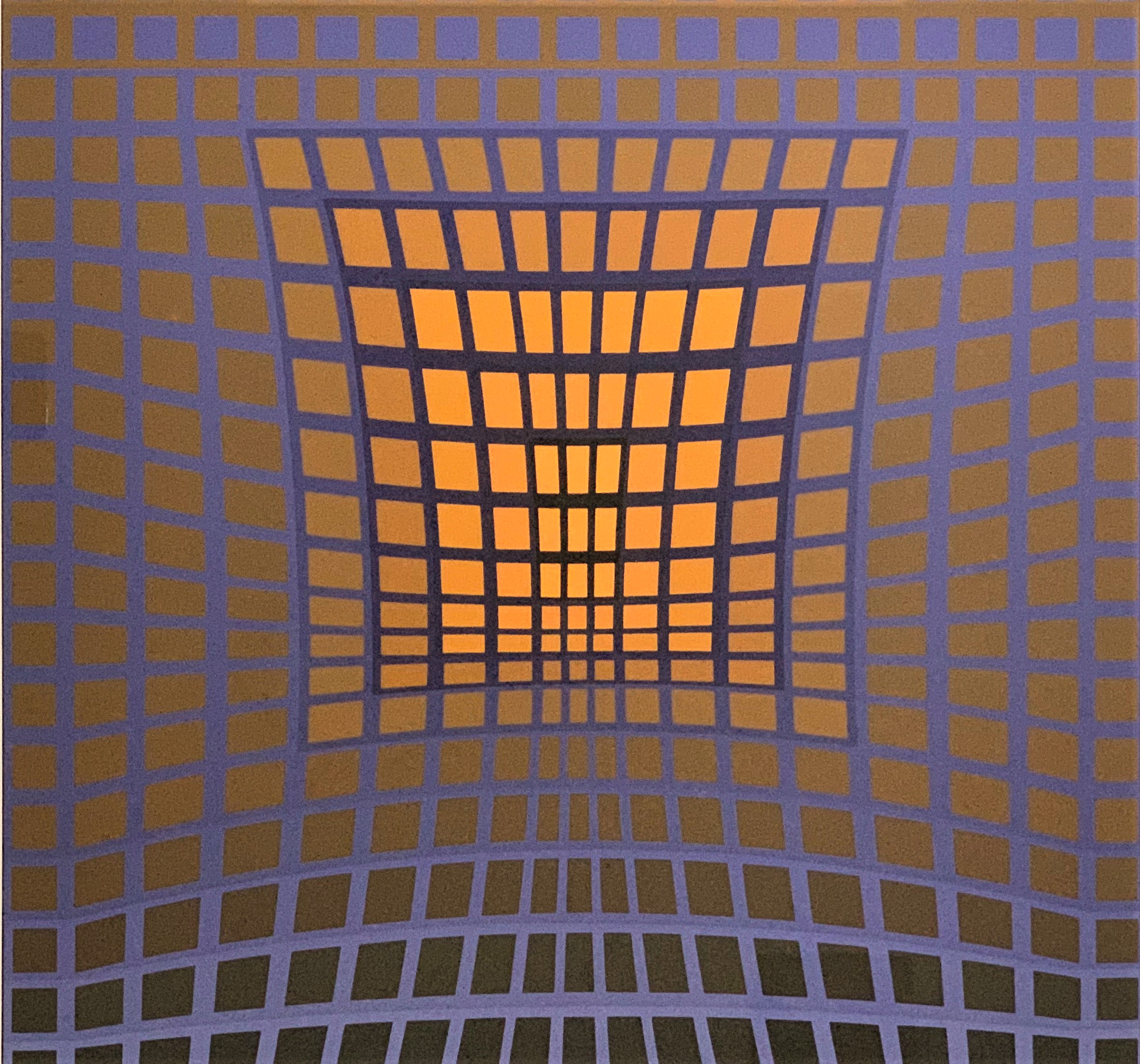 This work highlights Vasarely’s extraordinary facility with color and shapes and movement.  It is an exemplar of op art. And it is made even more appealing by its beautiful application of paints, which are bright, smooth, and remarkably crisp.  Photographs simply do not show the beauty of this work.  It is one of Vasarely’s most compelling works.