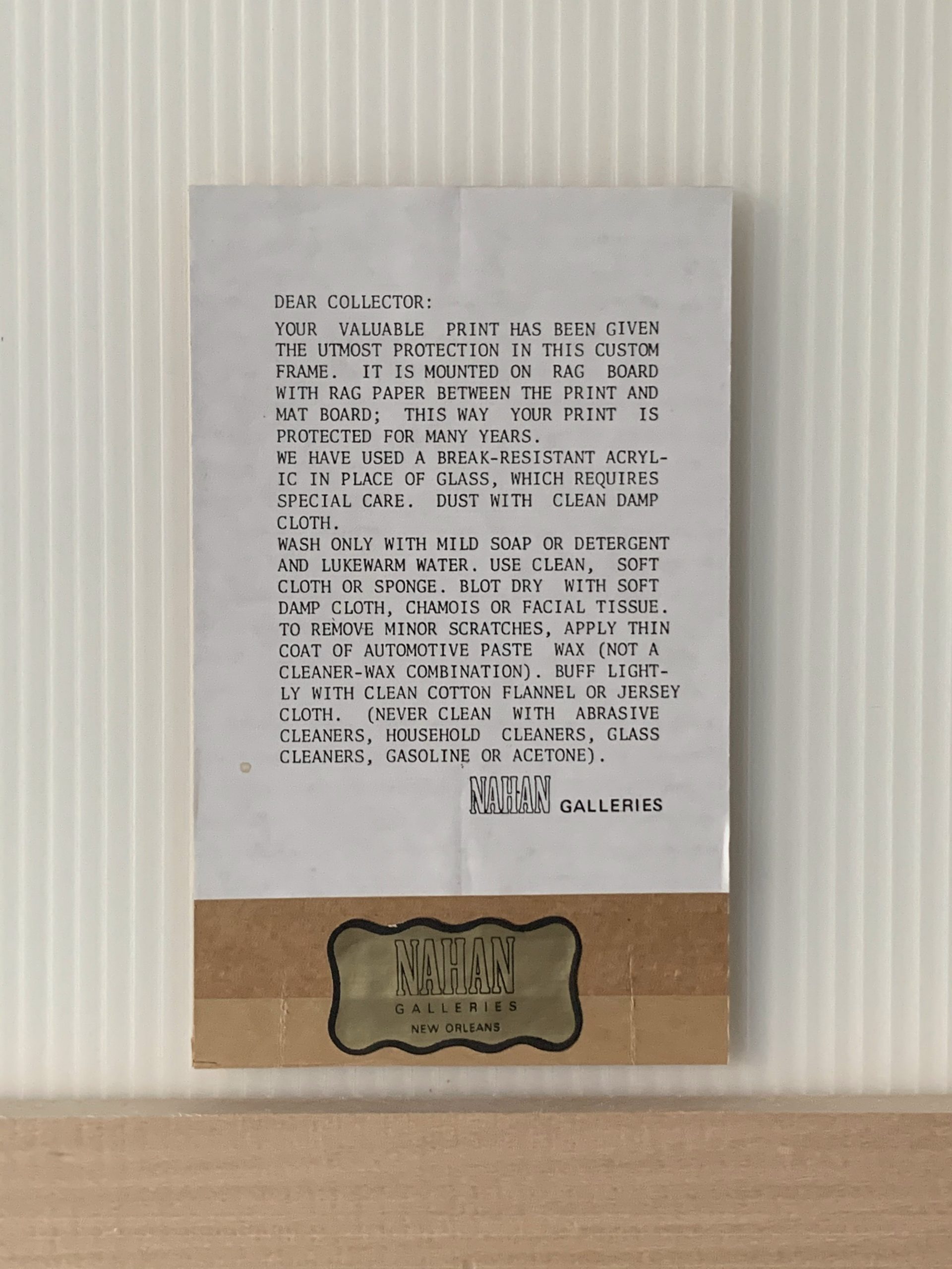 Reframed in 2020 using the existing fine hardwood frame, rebuilt by a master framer, and matted with an 8-ply conservation-grade mat. It is glazed with UV-protective plexiglass and the rear is protected by a panel of Coroplast.  Bearing the gallery sticker from Nahan Galleries (New Orleans) from the prior framing preserved en verso.