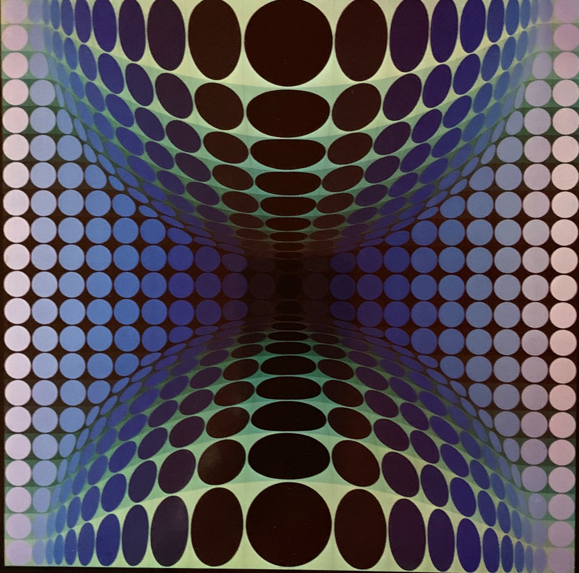 This small work by Victor Vasarely is a really terrific work of op-art! From the Homage a l’Hexagon portfolio. Great colors and striking in its black frame.