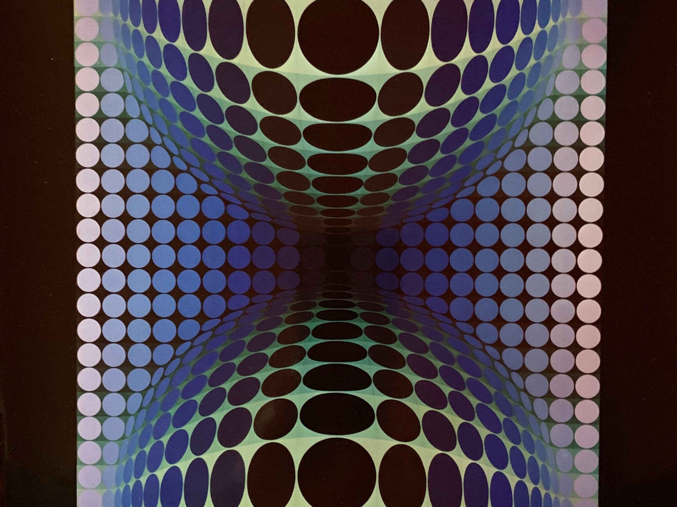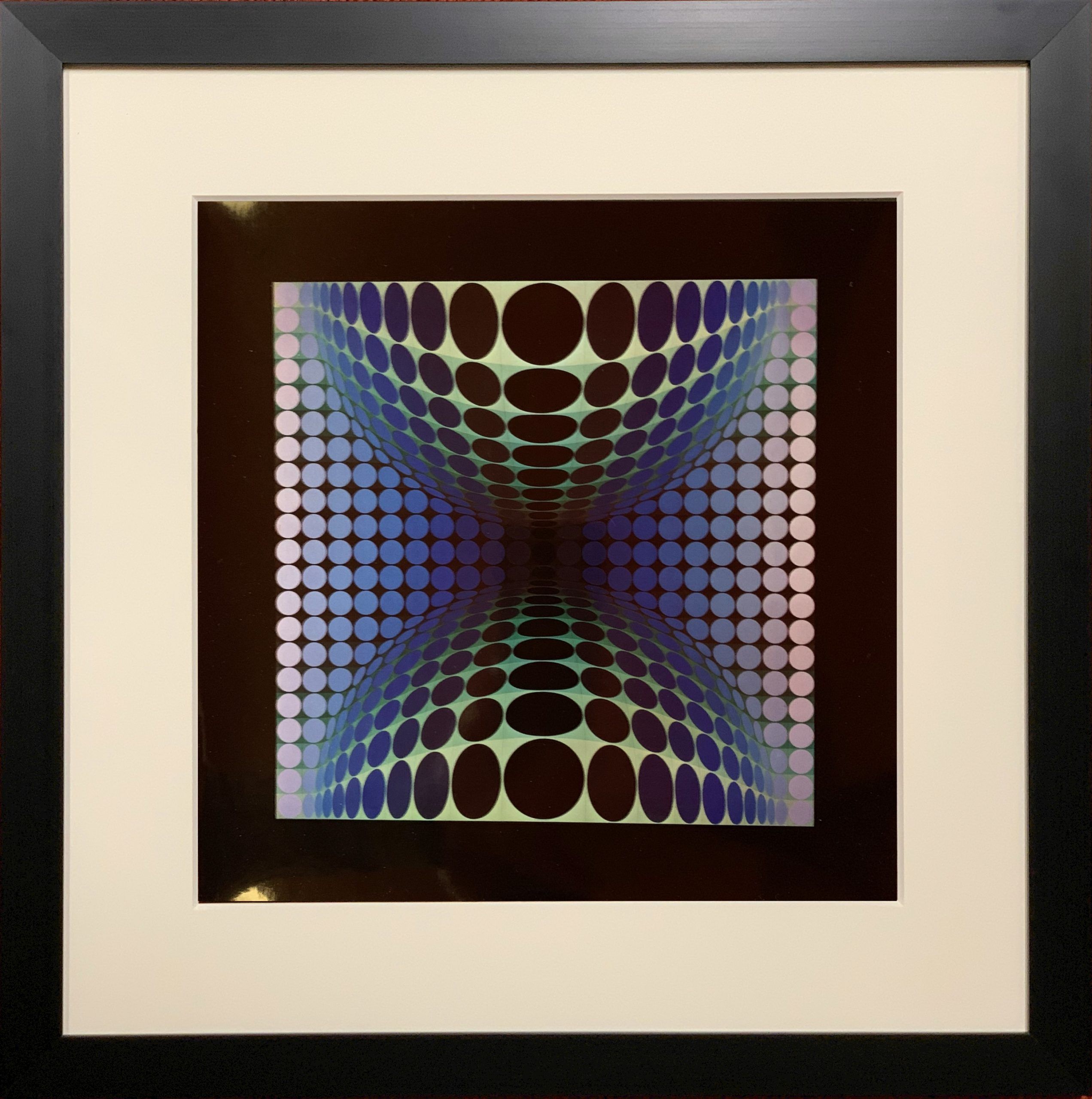 This small work by Victor Vasarely is a really terrific work of op-art!  From the Homage a l’Hexagon portfolio.  Great colors and striking in its black frame.