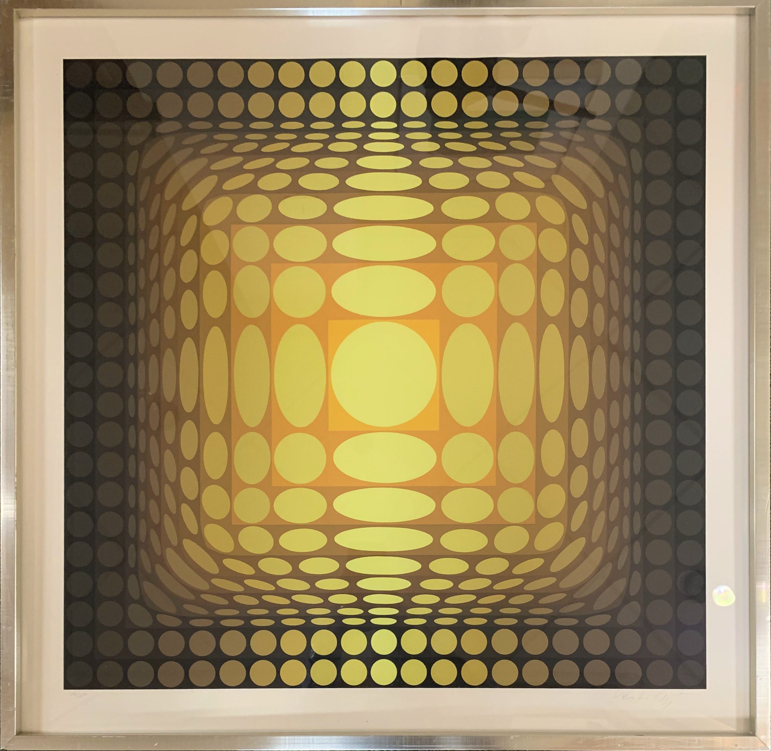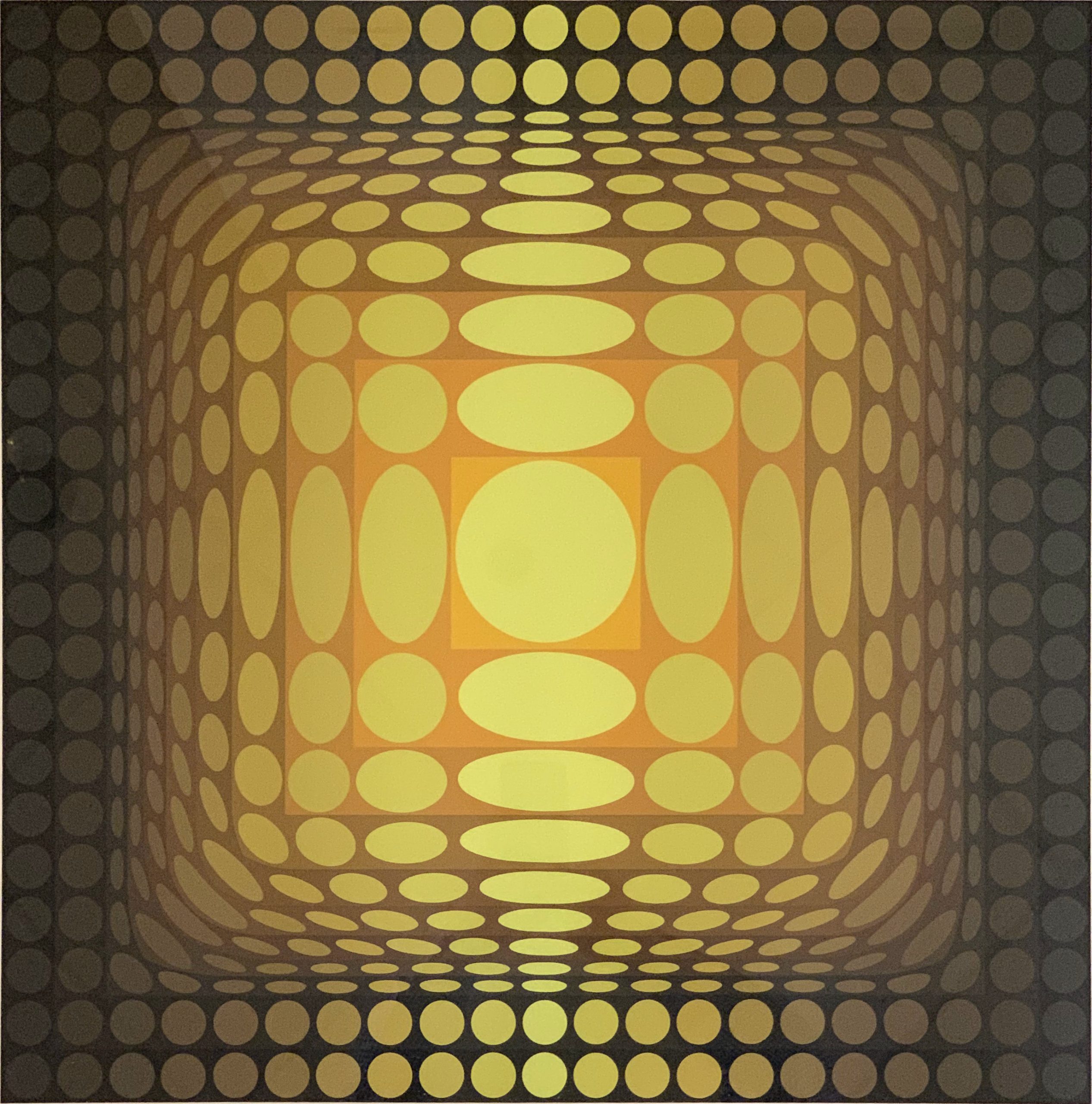This work, Koska-Mez, highlights Vasarely’s facility with color and with shapes and movement. It is an exemplar of op art.  This silkscreen is a print of the 1972 acrylic of the same name.