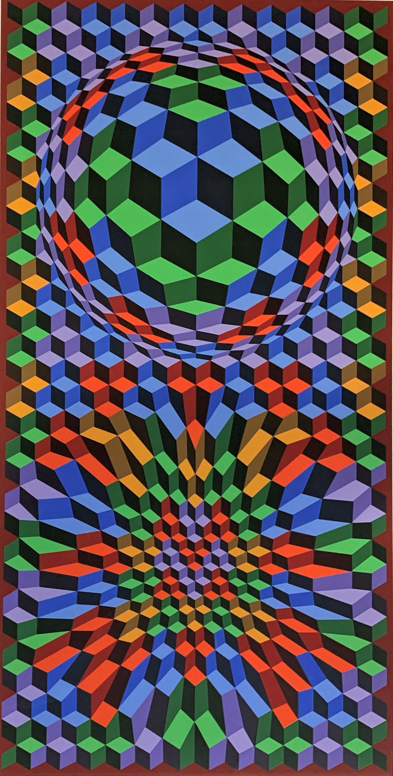 Victor Vasarely was the father of “Op Art”—making images that we could easily create today with computers but that in the middle parts of the Twentieth Century required a magical combination of mathematical and creative genius to create. This work highlights Vasarely’s facility with color and with shapes and movement. It is an exemplar of op art, even the more so for its beautiful application of paints, which are right, smooth, and remarkably crisp.
