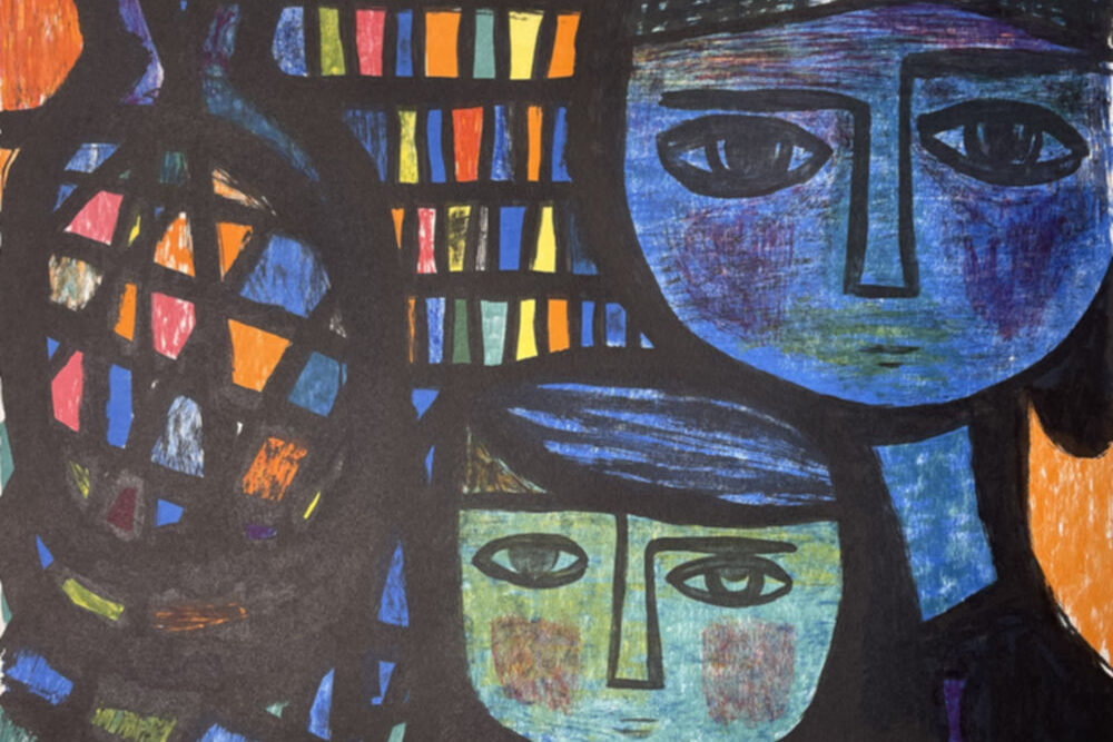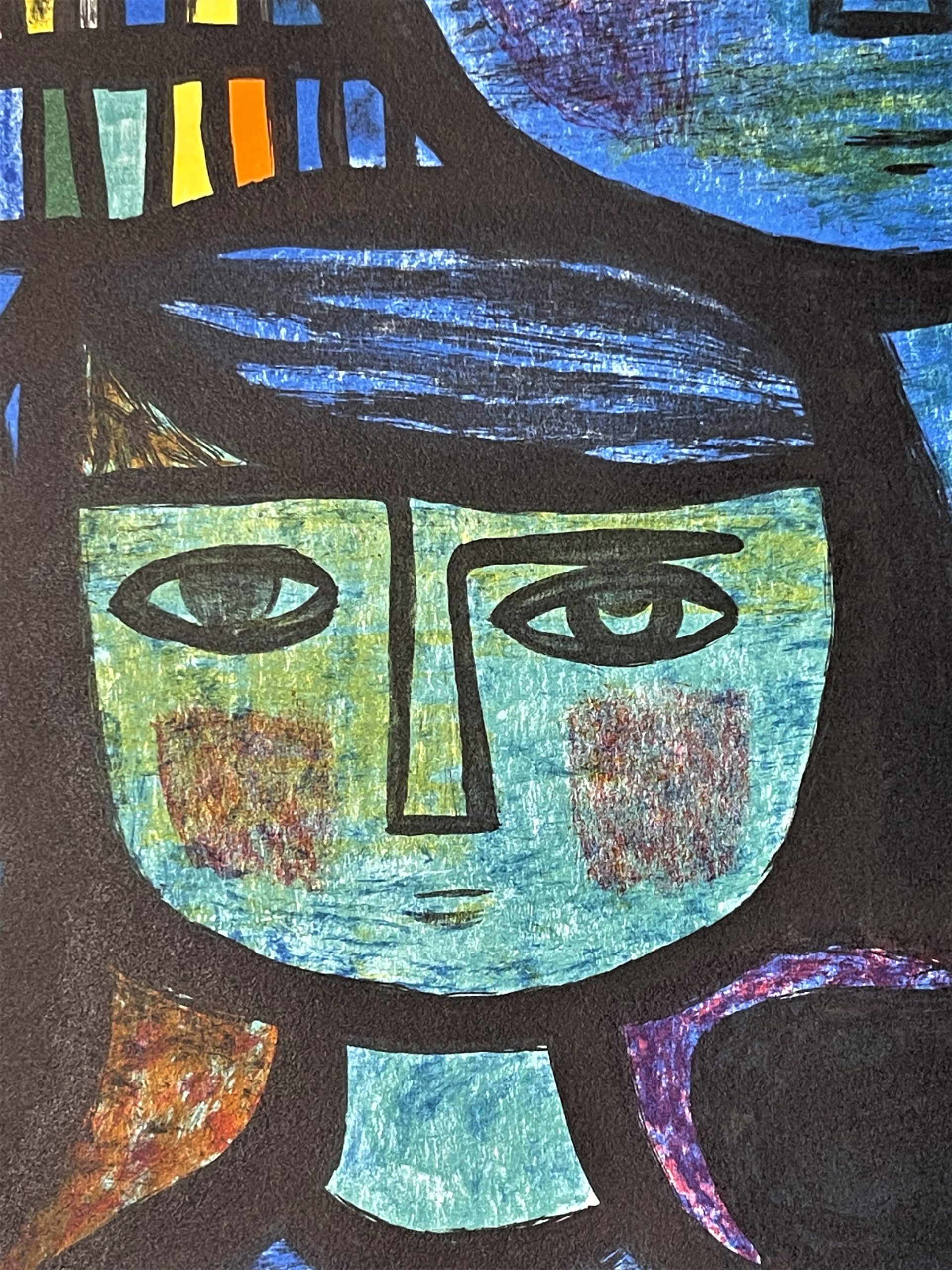 Hilde Weingarten has created a portrait of a woman in a girl in a Fauvist palette, using an interesting mix of geometrical and organic shapes, standing in front of what appears to be stained glass. Weingarten’s use of bold black lines resembles Georges Rouault’s famous stained-glass-inspired works.