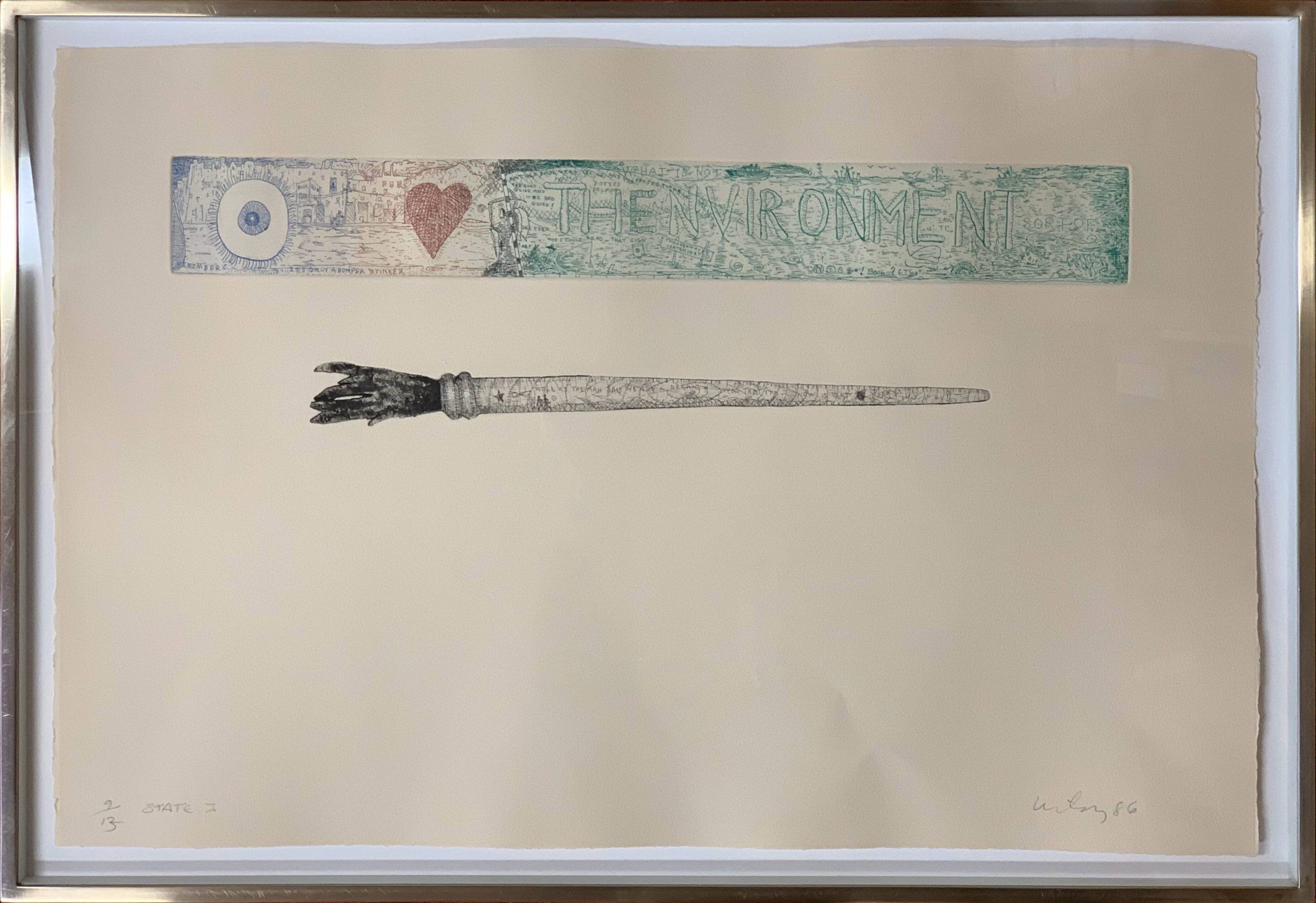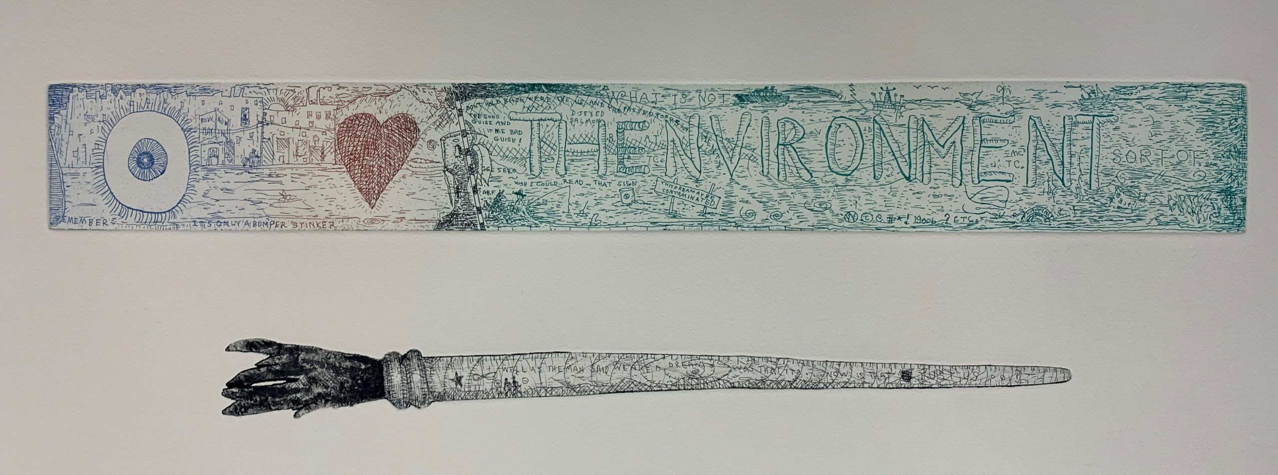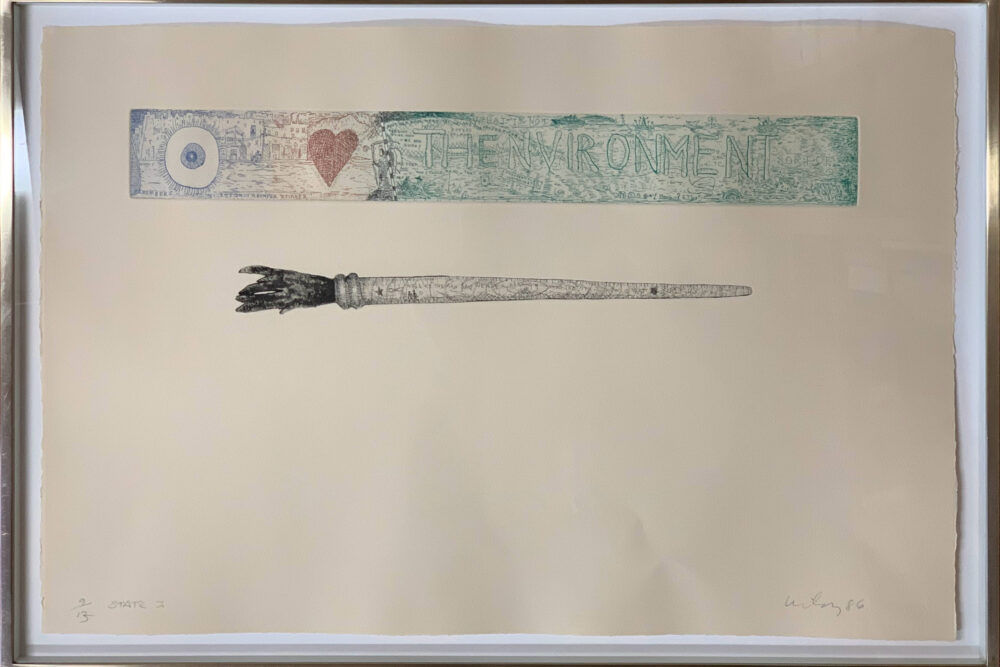 William T. Wiley’s plea to environmentalism, depicting two totemic items: a stave and a torch-like wand, both heavily enriched with the written word, a heart, and an eye. Since the mid-1960s Wiley has laid bare the lies and deceptions behind environmental catastrophes and other issues of the world.