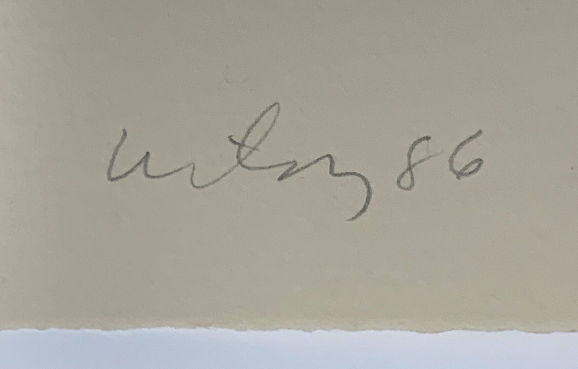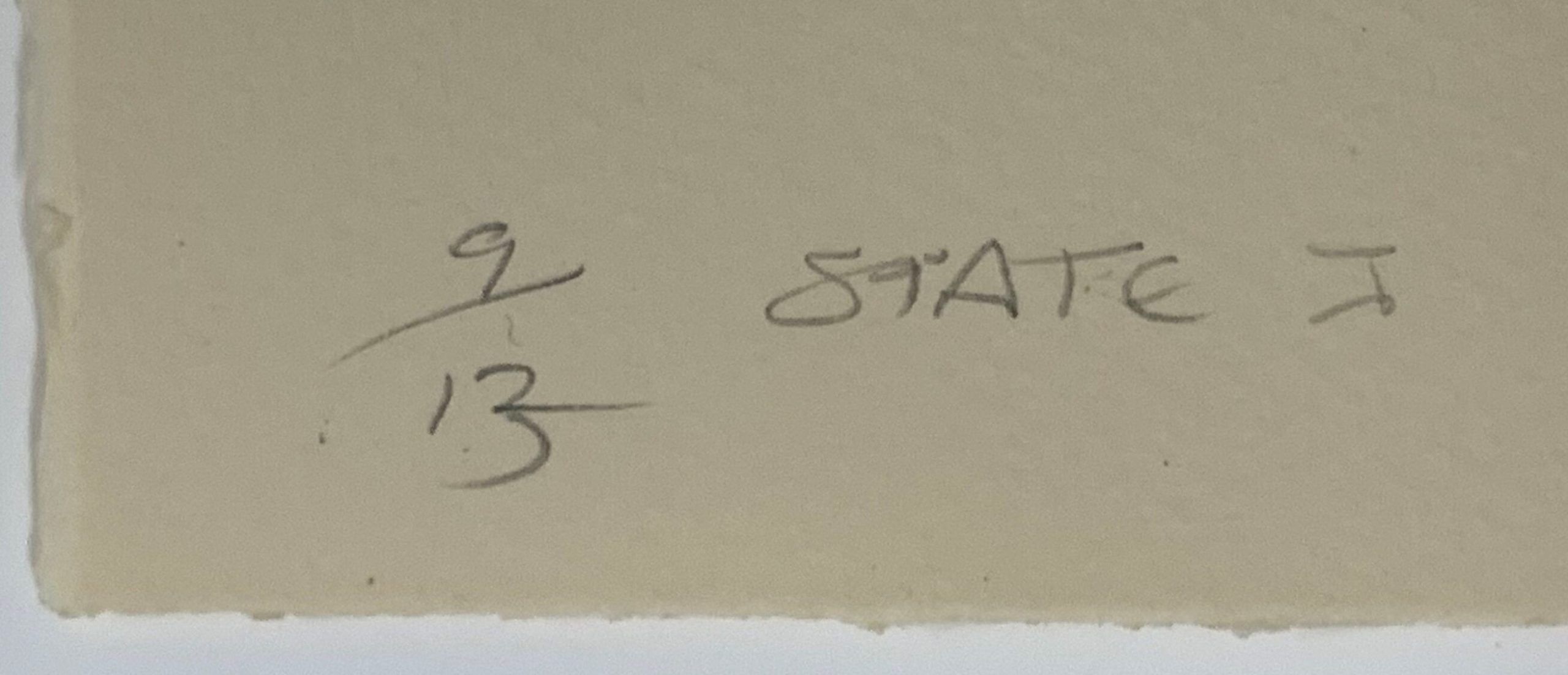 Signed by the artist in pencil, en recto lower right with date (“86”). Editioned, in pencil, en recto lower left.  Bearing the Teaberry Press blind stamp en recto lower right