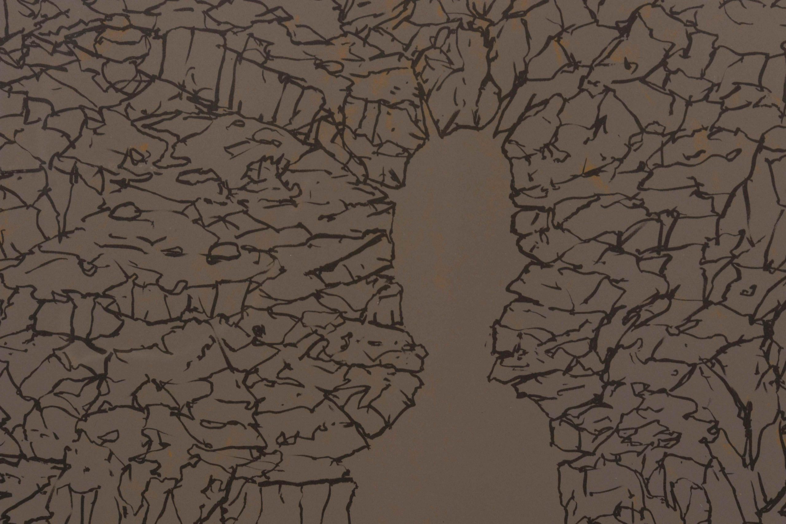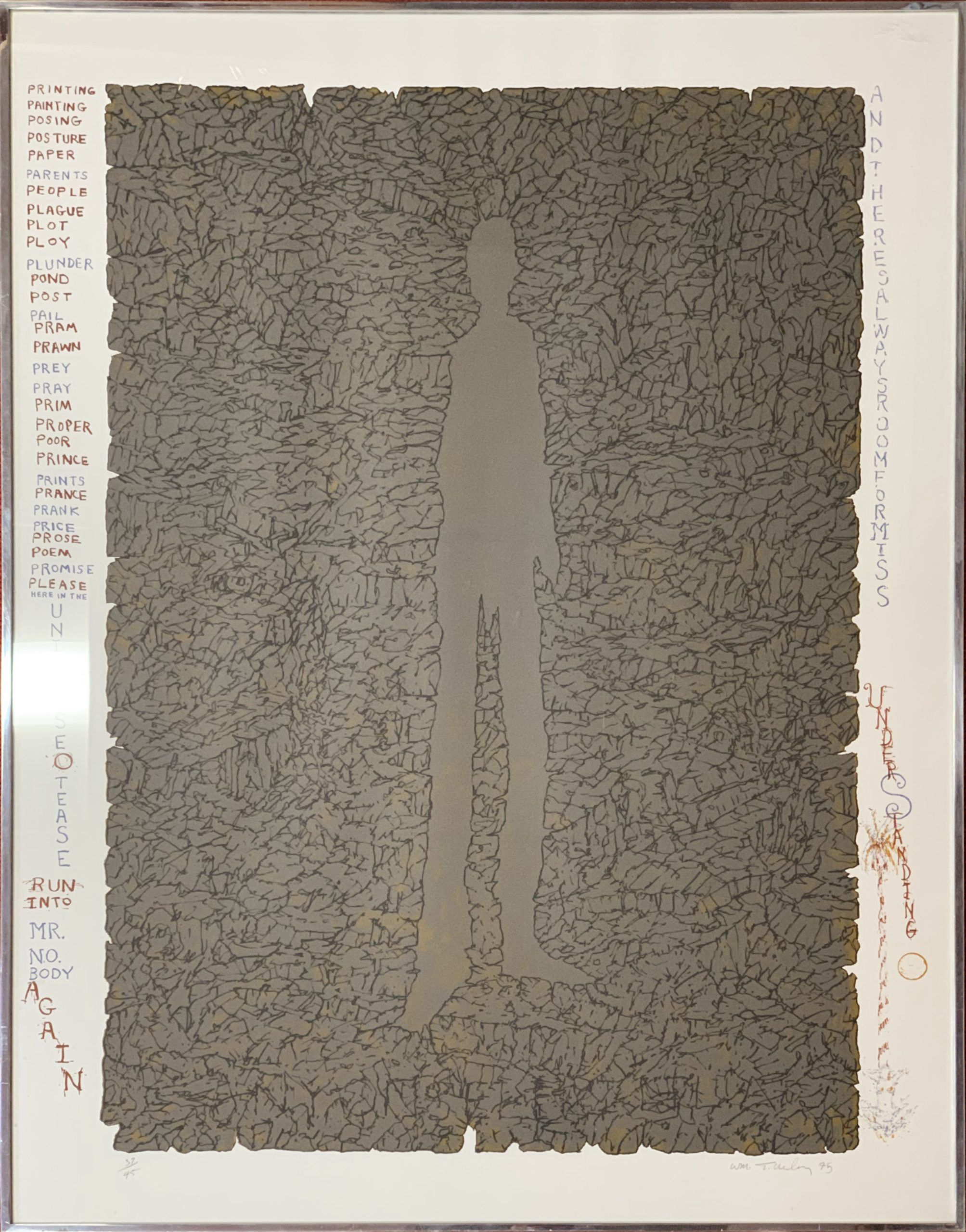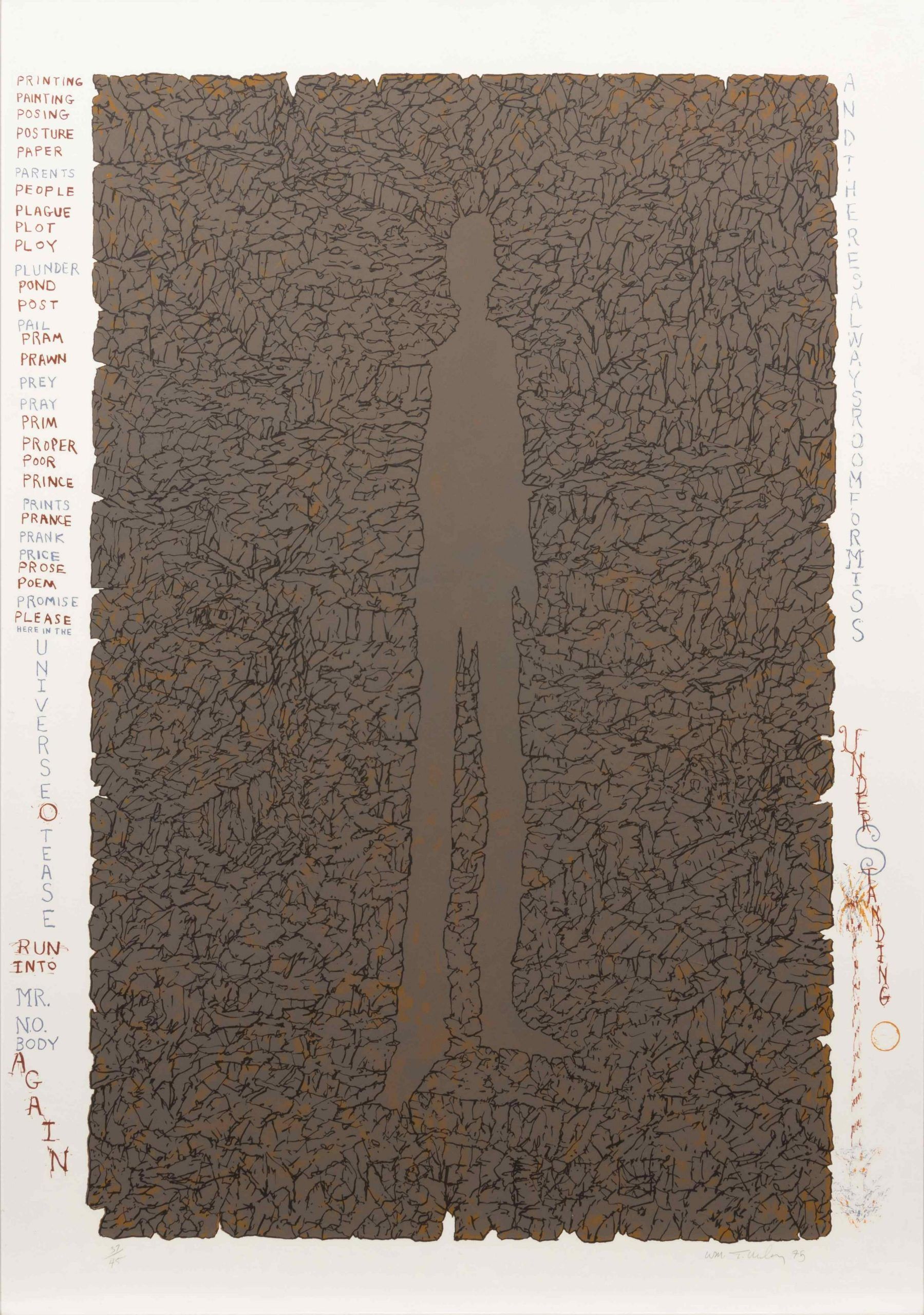 Mr. Nobody—a white figure shaped of empty space—surrounded by a net-like area of black lines. With text in the margins.  Powerful, evocative, a masterwork by William T. Wiley.