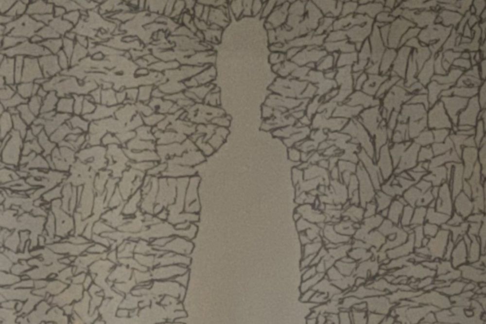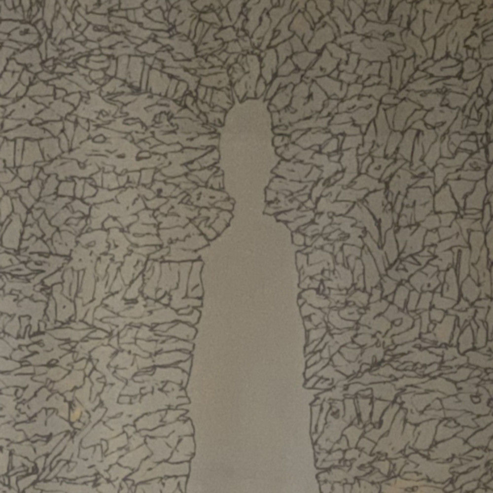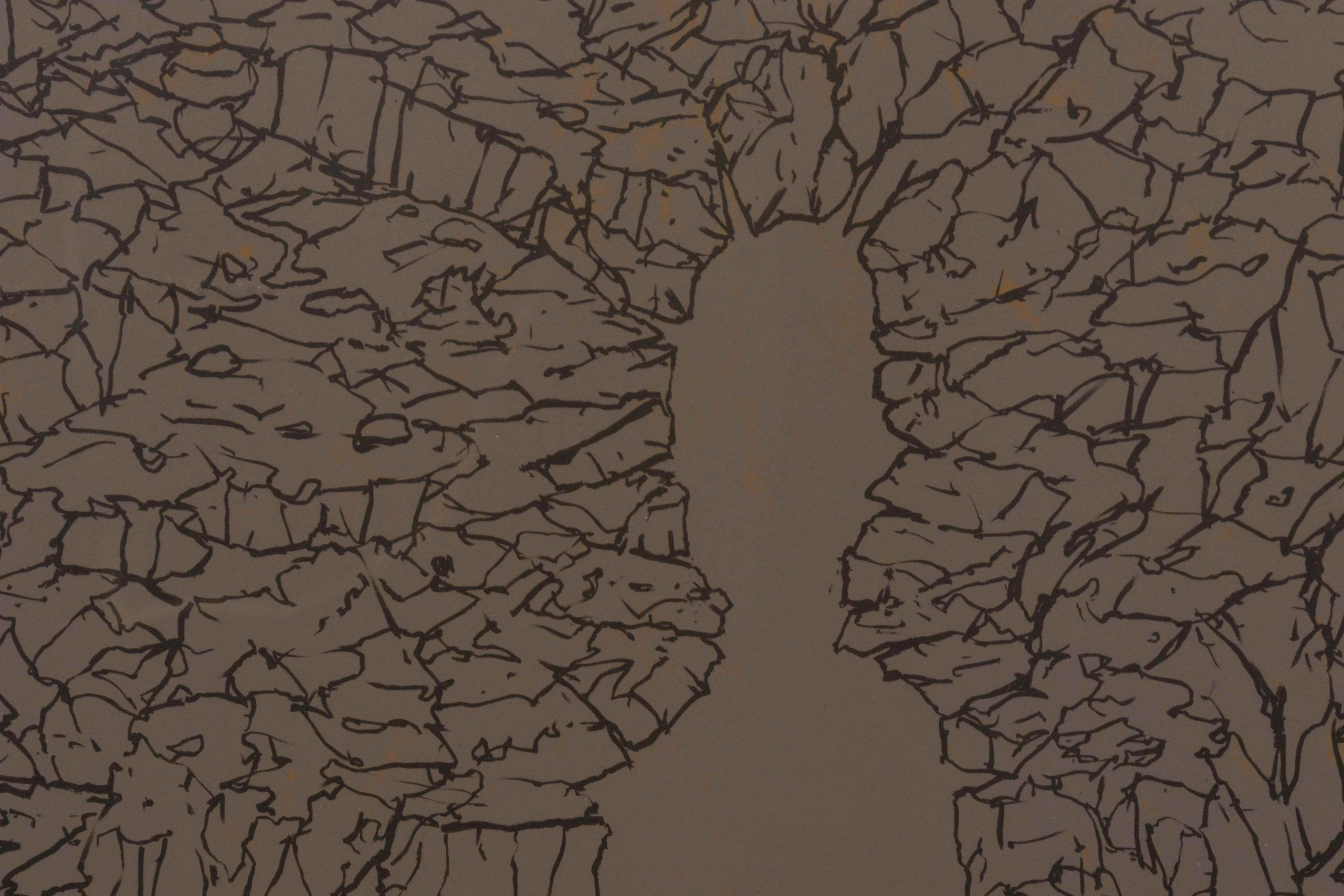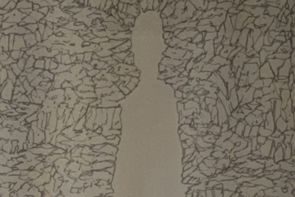 Mr. Nobody—a white figure shaped of empty space—surrounded by a net-like area of black lines. With text in the margins.  Powerful, evocative, a masterwork by William T. Wiley.