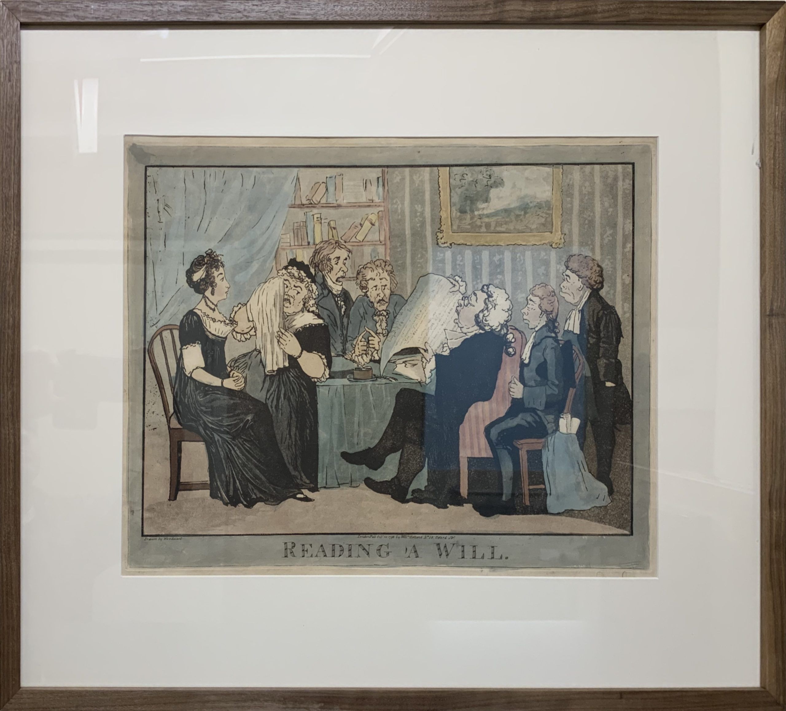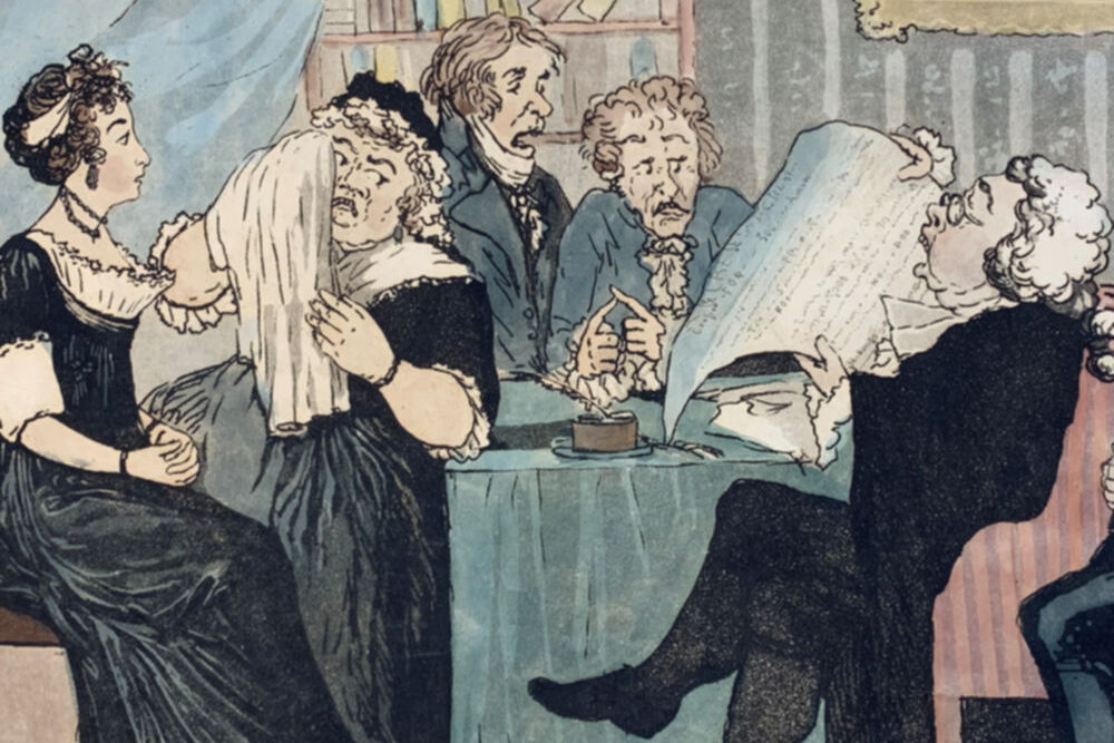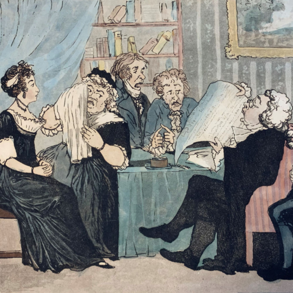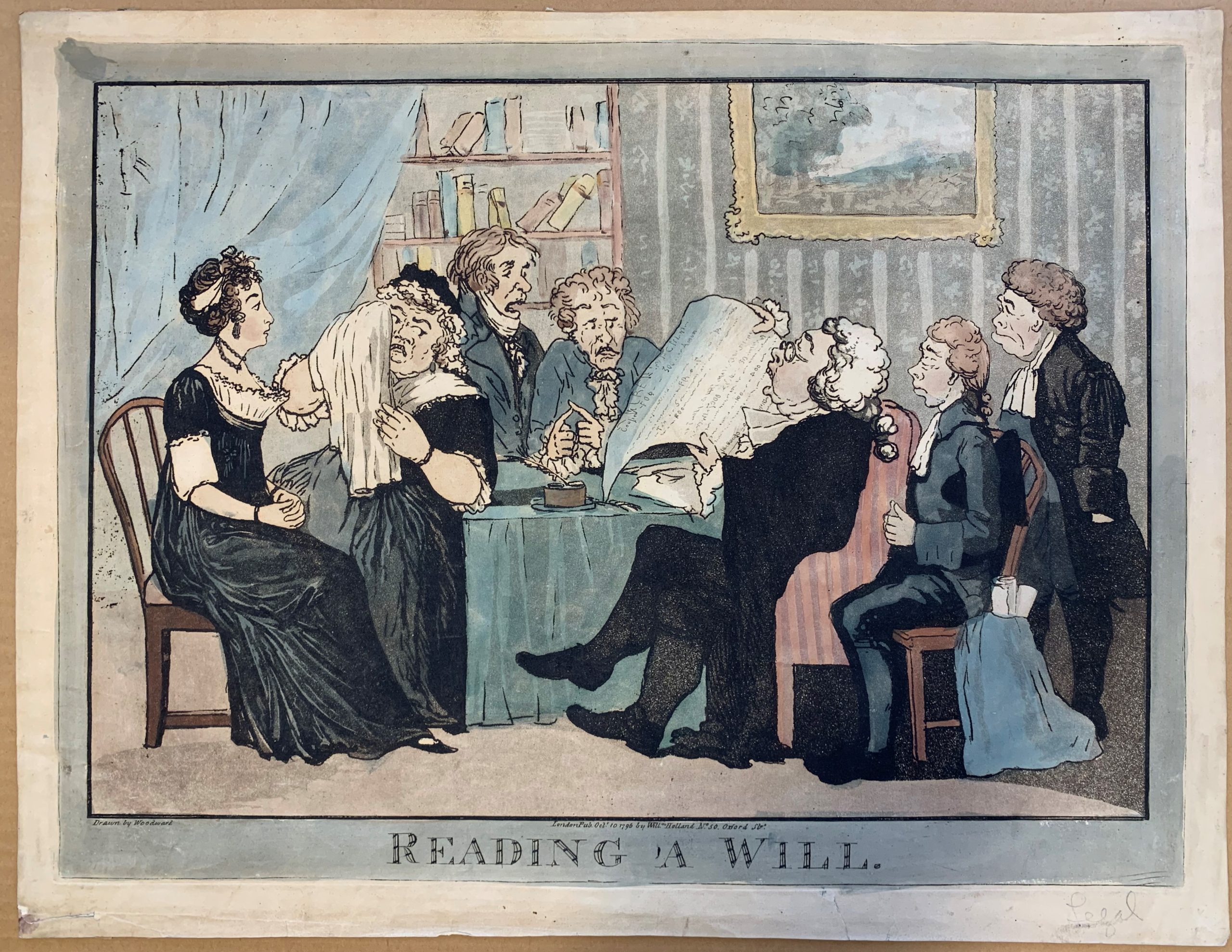 A caricature of a lawyer reading a will and the varied reactions of the listeners, by George Woodward.