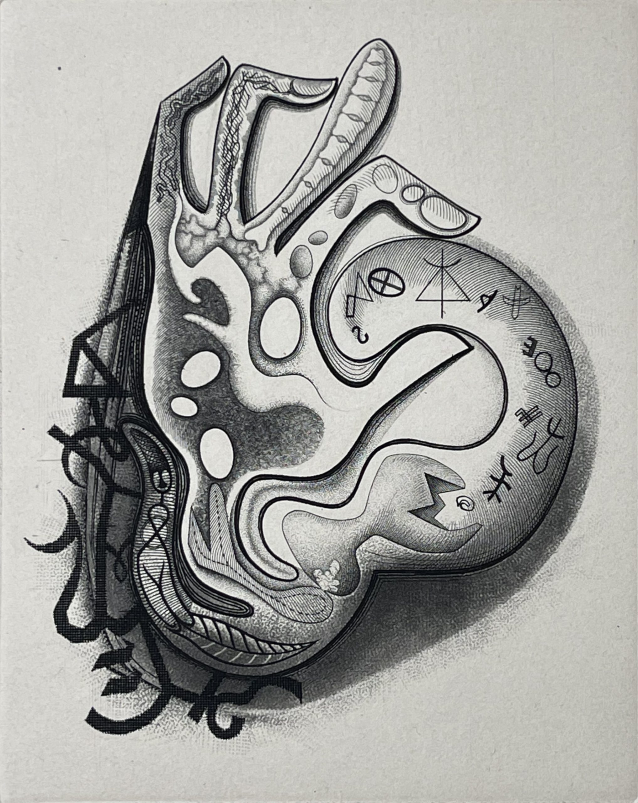 The Creator by Albert-Edgar Yersin was part of a 1949 portfolio produced by an artist’s group in Paris called “Graphies”, formed in 1948 by Henri Goetz, Christine Boumeester, Andre Flocon, and Raoul Ubac. They decided that for their first collective album no subject could be more suitable for engravers united in their love for the work—and who believe that the struggle with the work is the raison d’être of their art—than the human hand. The resultant portfolio, “For the Glory of the Hand” [La Gloire de la Main], was completed on Wednesday, June 15, 1949.
