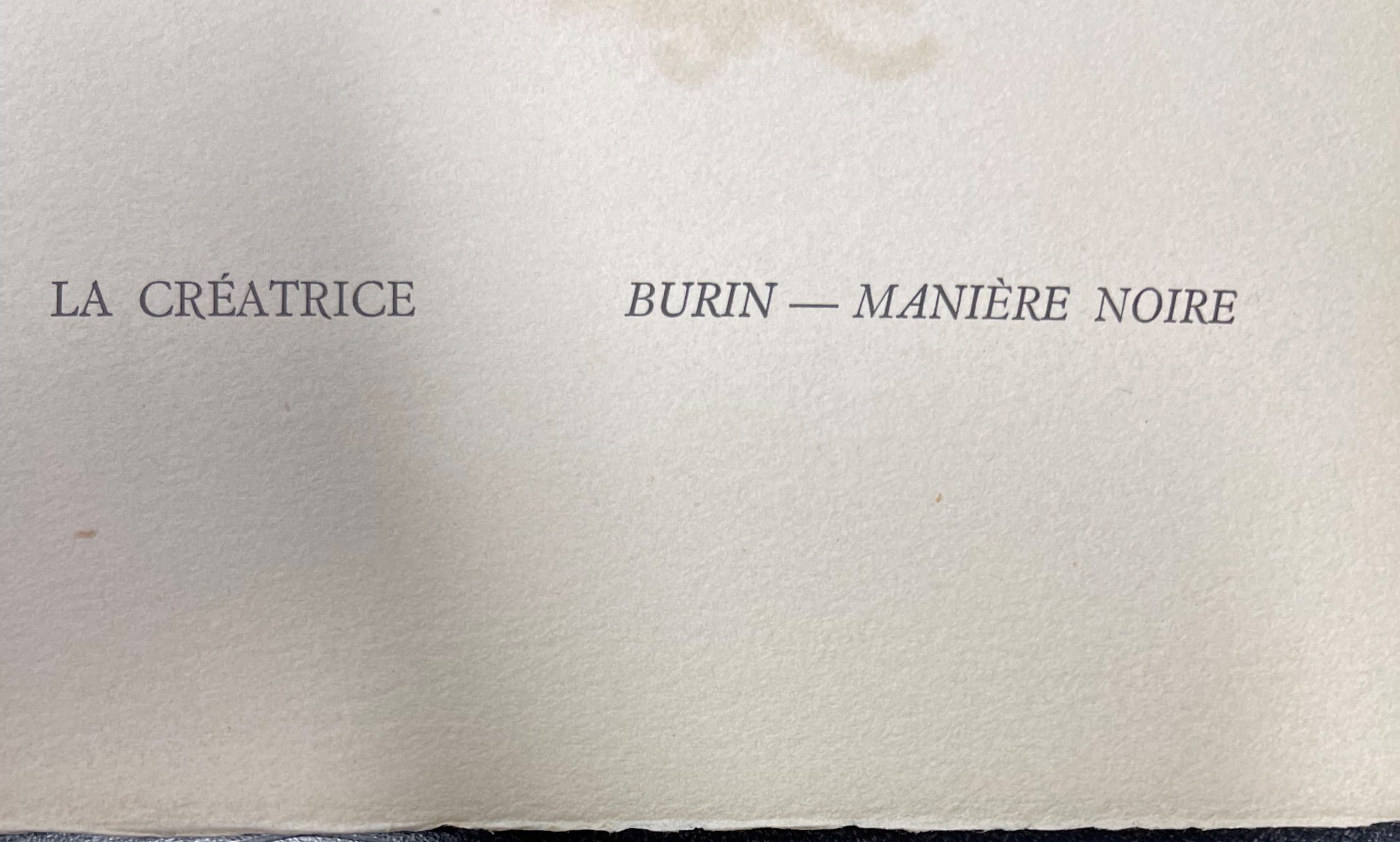 This is the ninth impression out of the 26 examples printed on Arches vellum, aside from 134 examples which were printed on Arches vergé (laid) paper, and four copies not for commerce. The plate was destroyed after printing.