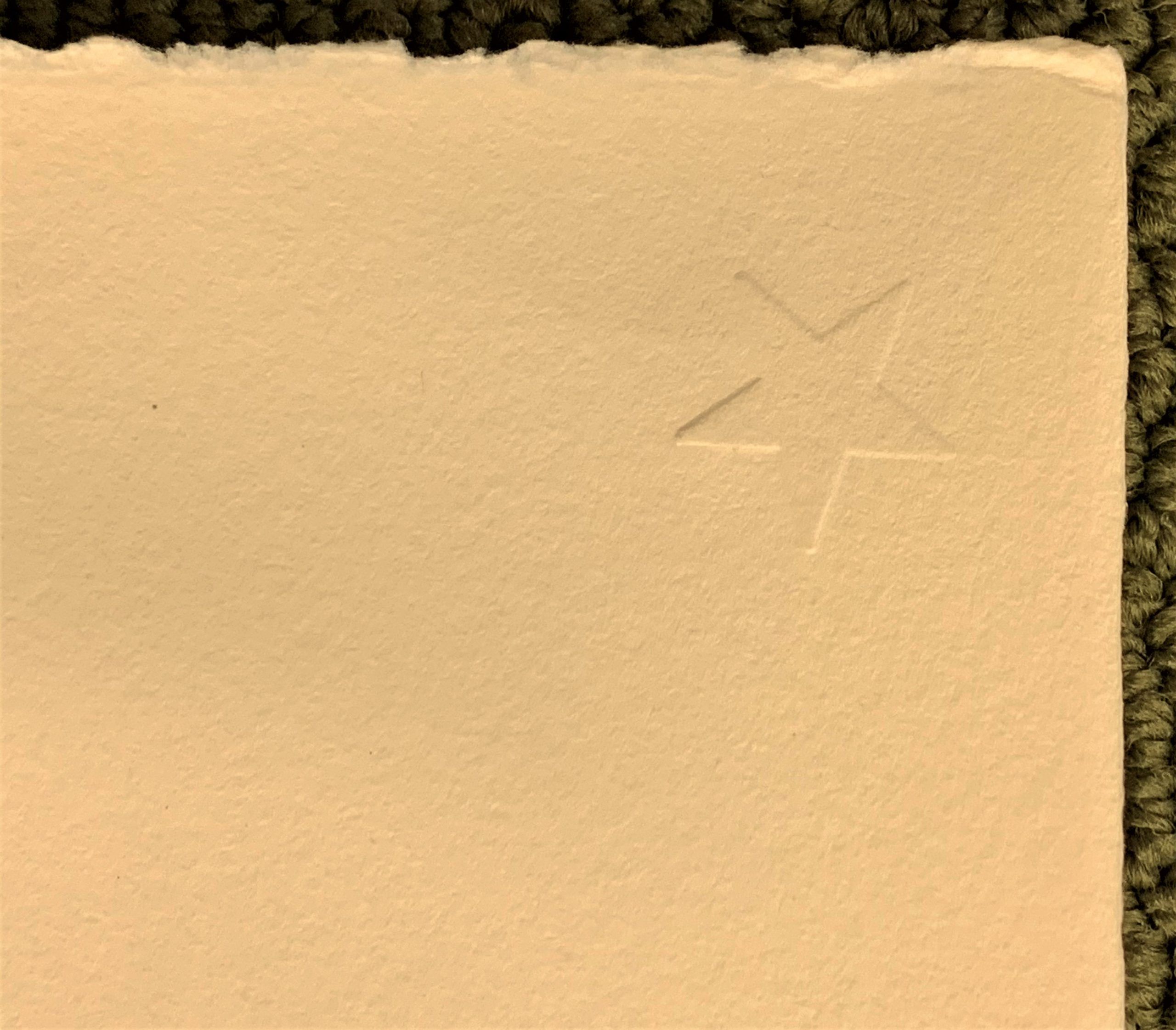 Signed and dated by the artist in pencil, en recto lower center, and with the publisher’s blind emboss en recto lower left.