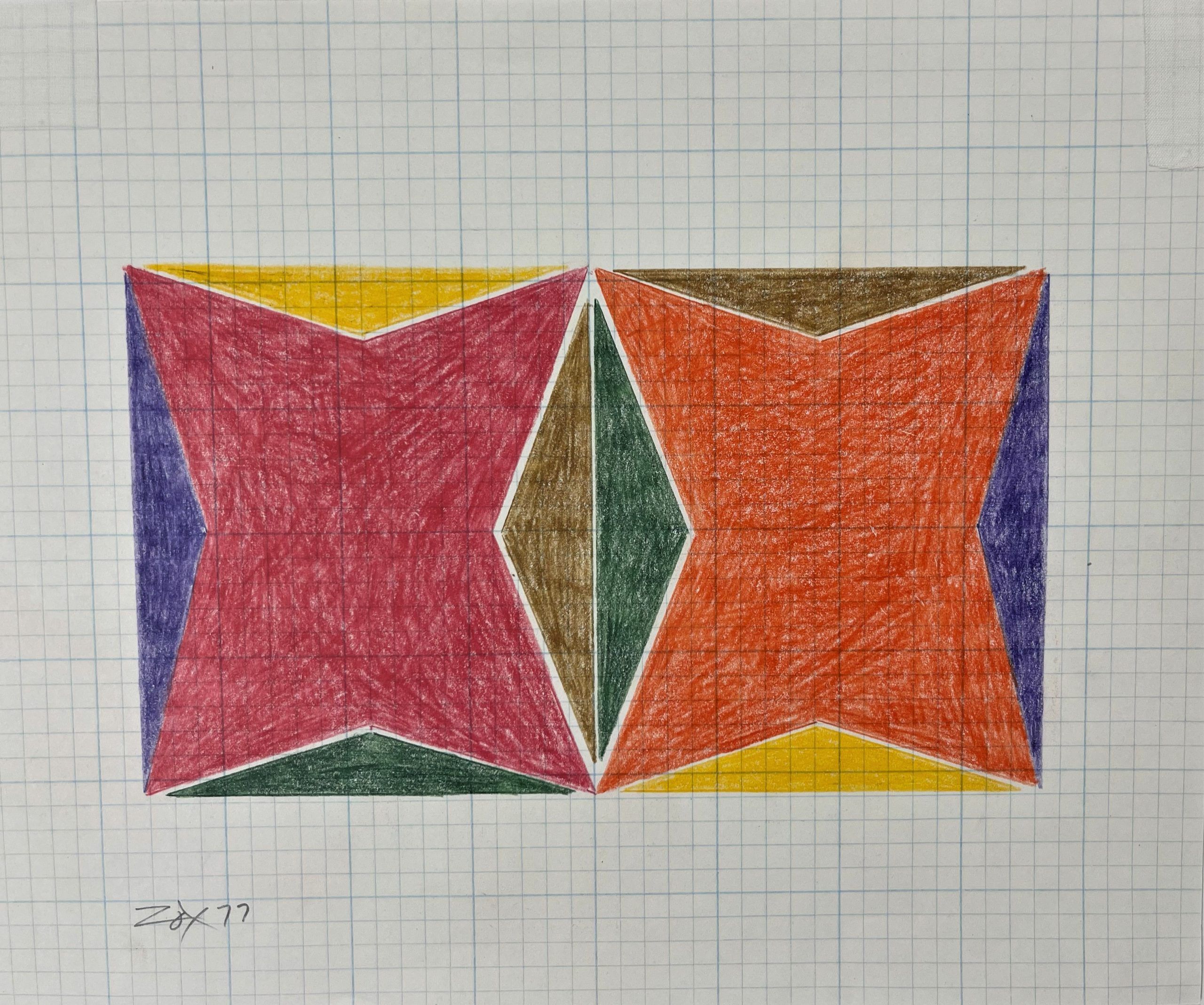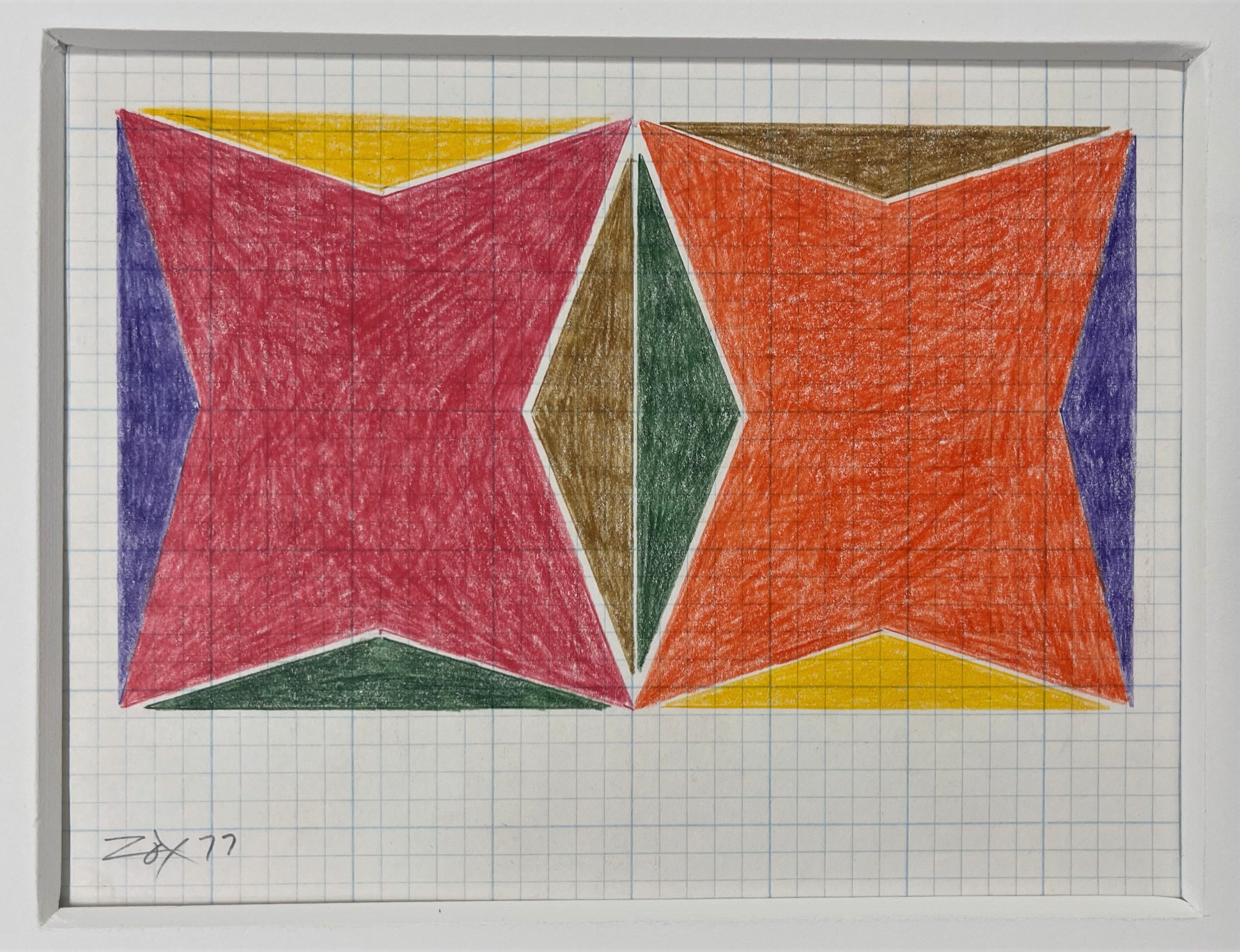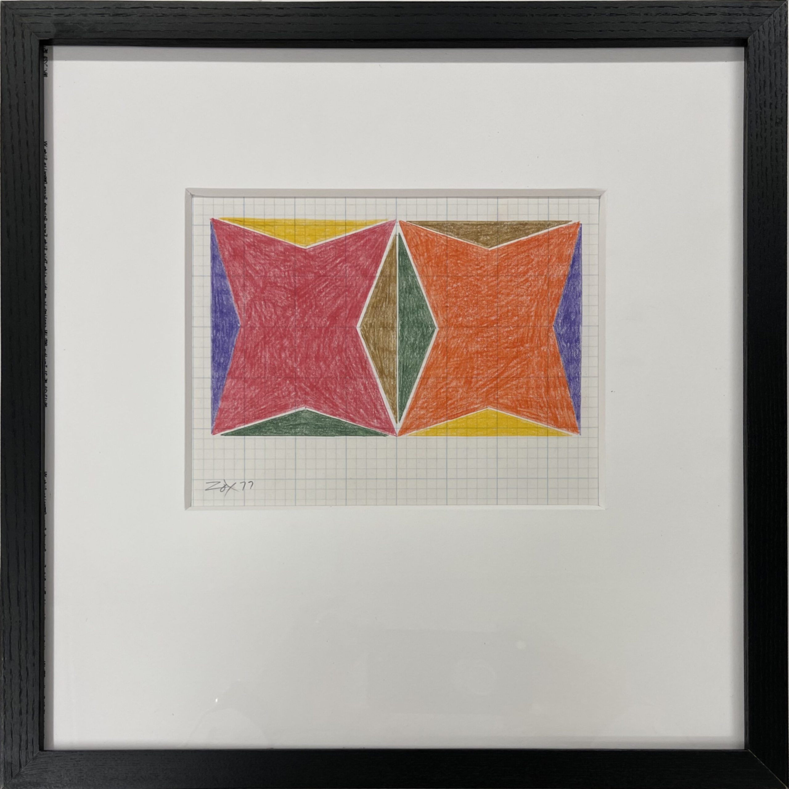 This work, by Larry Zox, one of the most important of the hard-edge geometric abstractionists, is a study for his Gemini series. This form, which appeared in the Peace portfolio along with works such as Niantic and Malvern, demonstrates Zox’s extraordinary skill as a colorist and his fluency with shape and form.